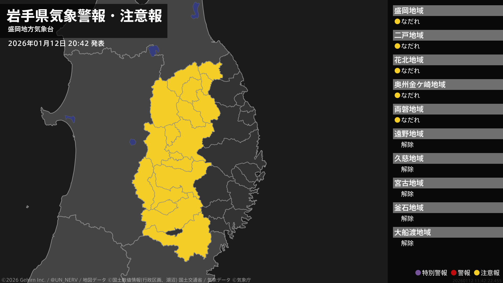 【岩手県 気象警報・注意報 2026年01月12日 20:42】内陸では、14日までなだれに注意してください。#気象警報注意報 #岩手県