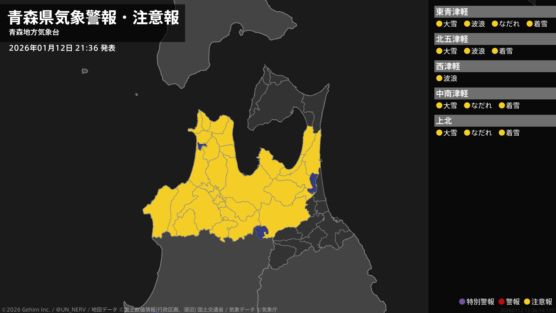 【青森県 気象警報・注意報 2026年01月12日 21:36】津軽、三八上北では、大雪やなだれ、電線等への着雪に注意してください。津軽では、高波に注意してください。#気象警報注意報 #青森県