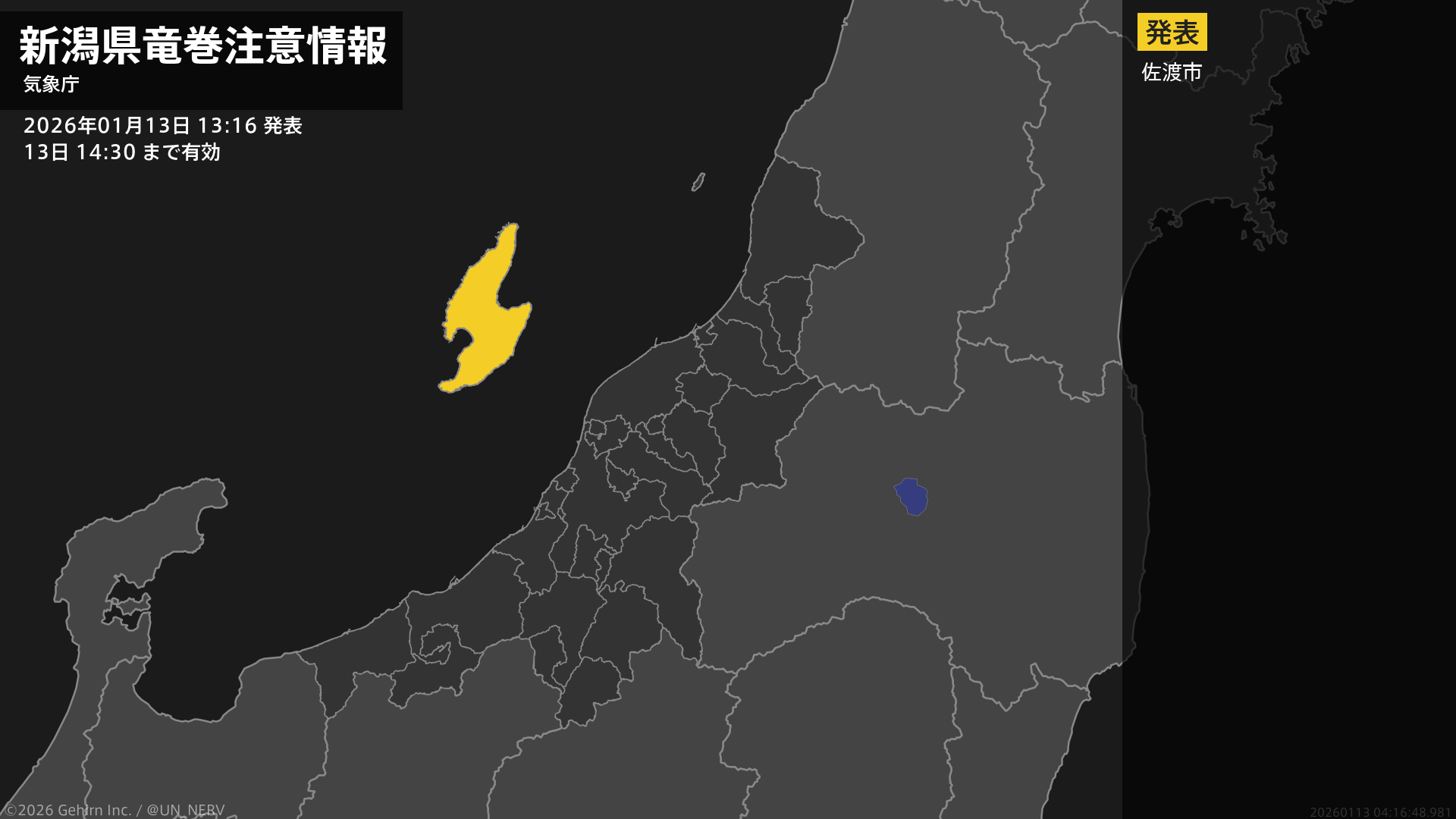 新潟県は、竜巻などの激しい突風が発生しやすい気象状況になっています。頑丈な建物内に移動するなど安全確保に努めてください。この情報は13日14:30まで有効です。