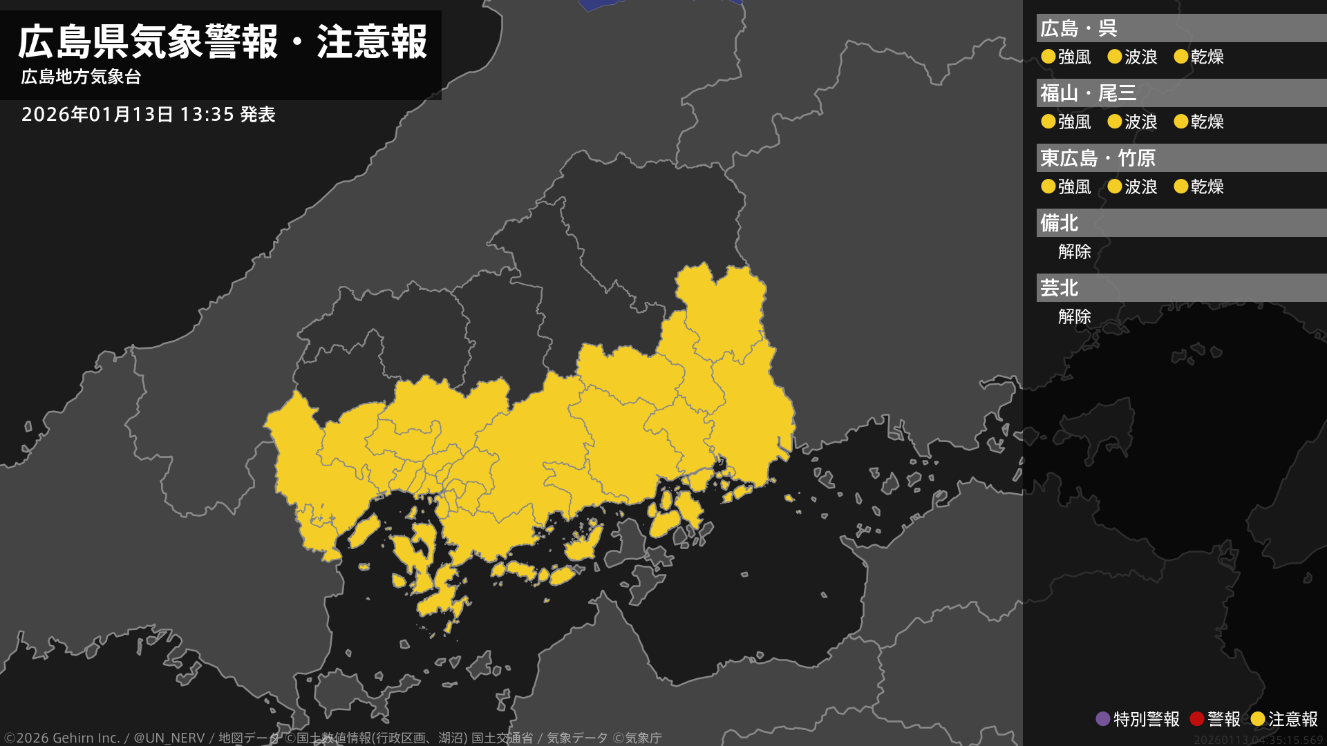 【広島県 気象警報・注意報 2026年01月13日 13:35】