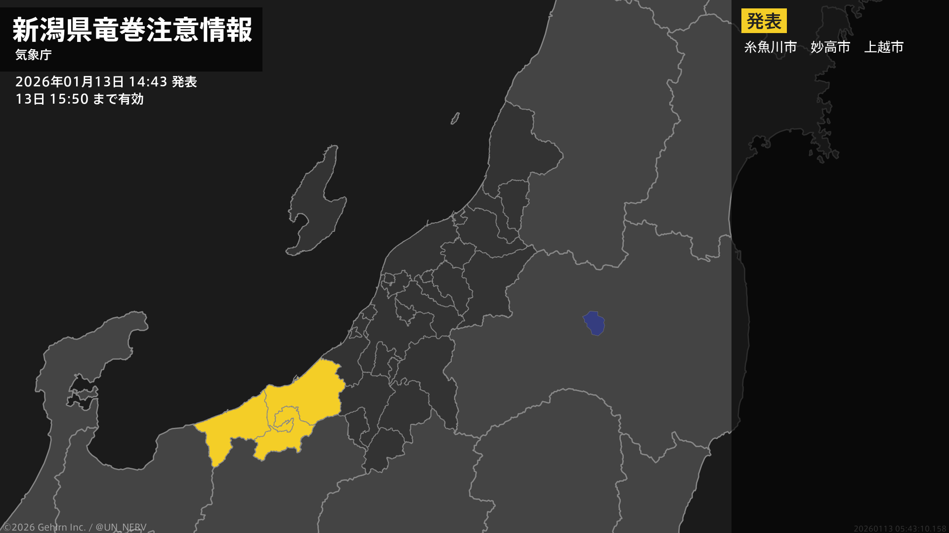 新潟県は、竜巻などの激しい突風が発生しやすい気象状況になっています。頑丈な建物内に移動するなど安全確保に努めてください。この情報は13日15:50まで有効です。