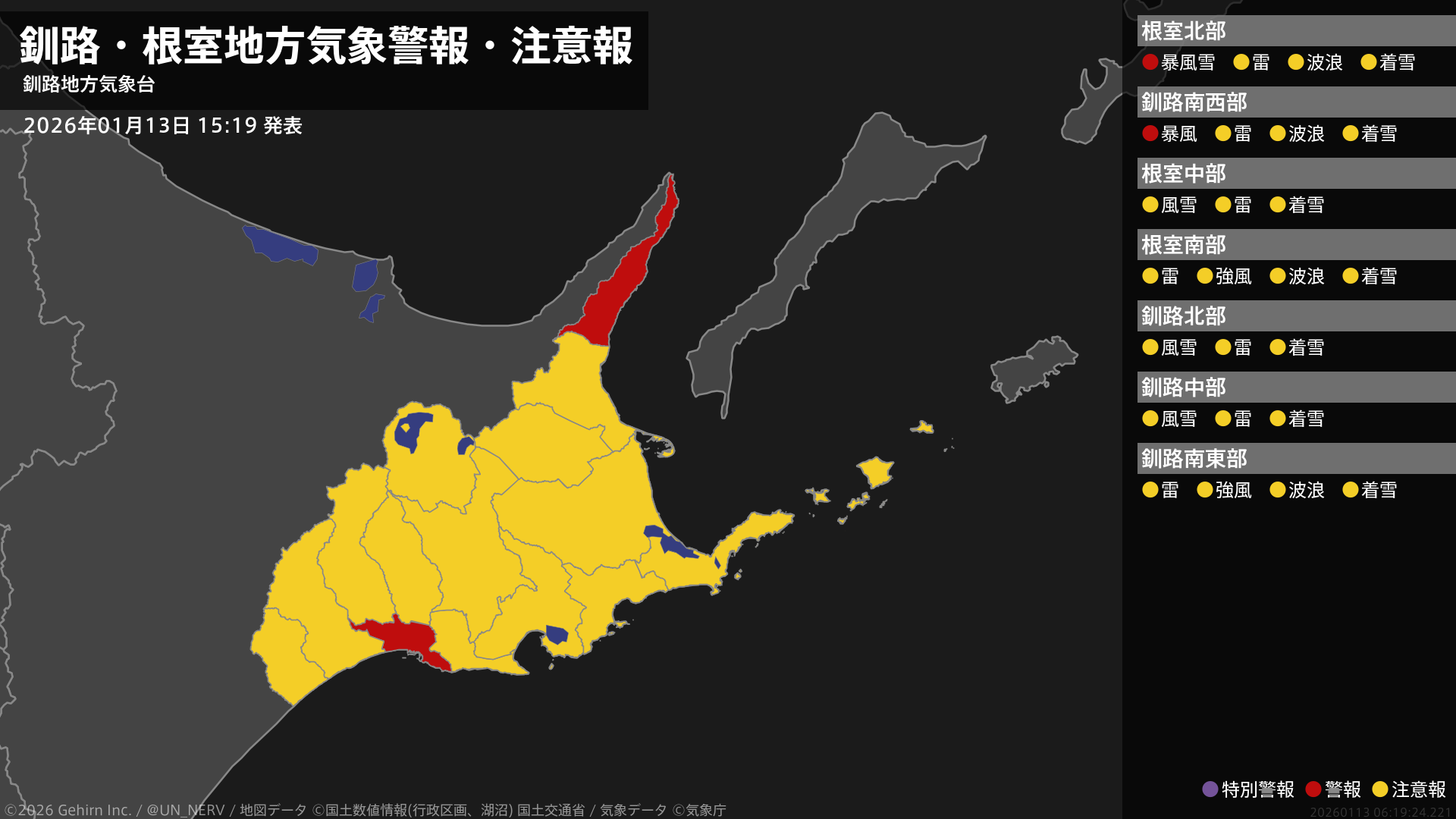 【釧路・根室地方 気象警報・注意報 2026年01月13日 15:19】