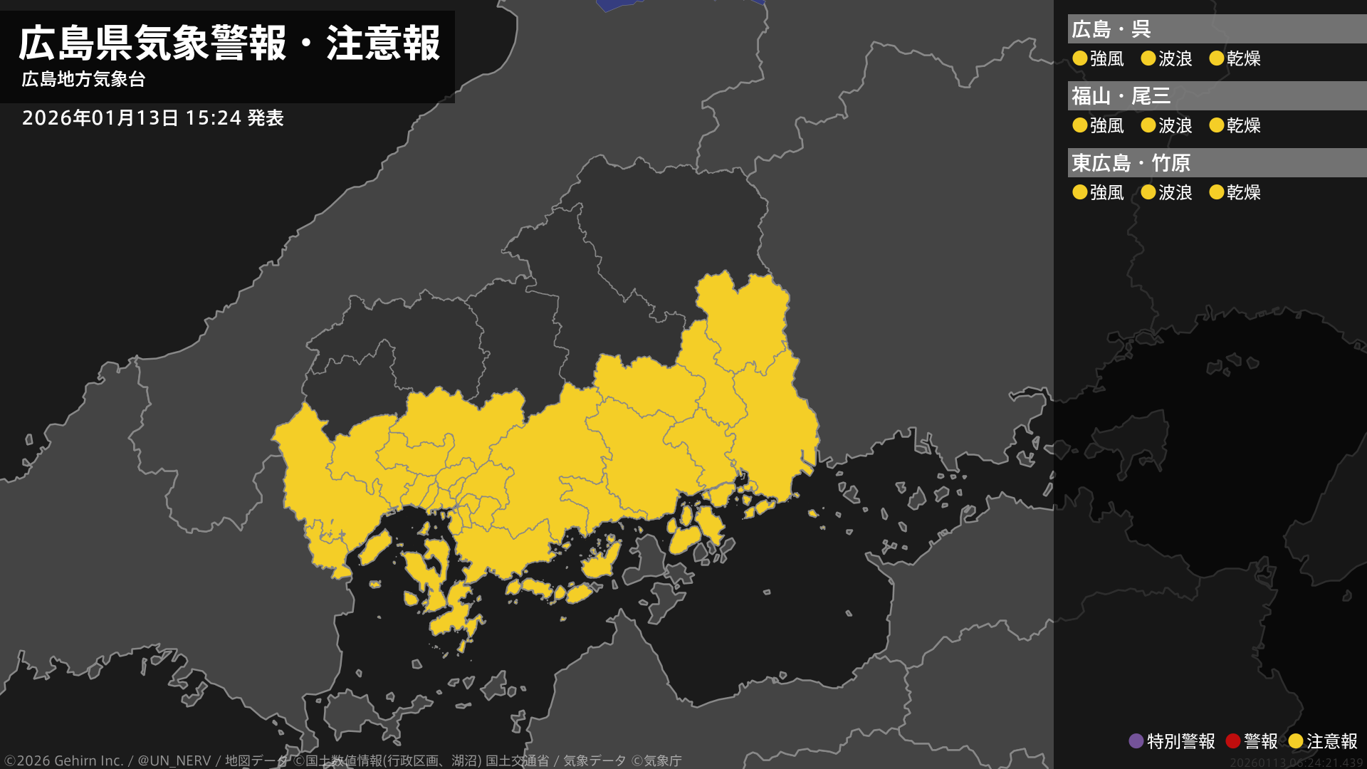 【広島県 気象警報・注意報 2026年01月13日 15:24】