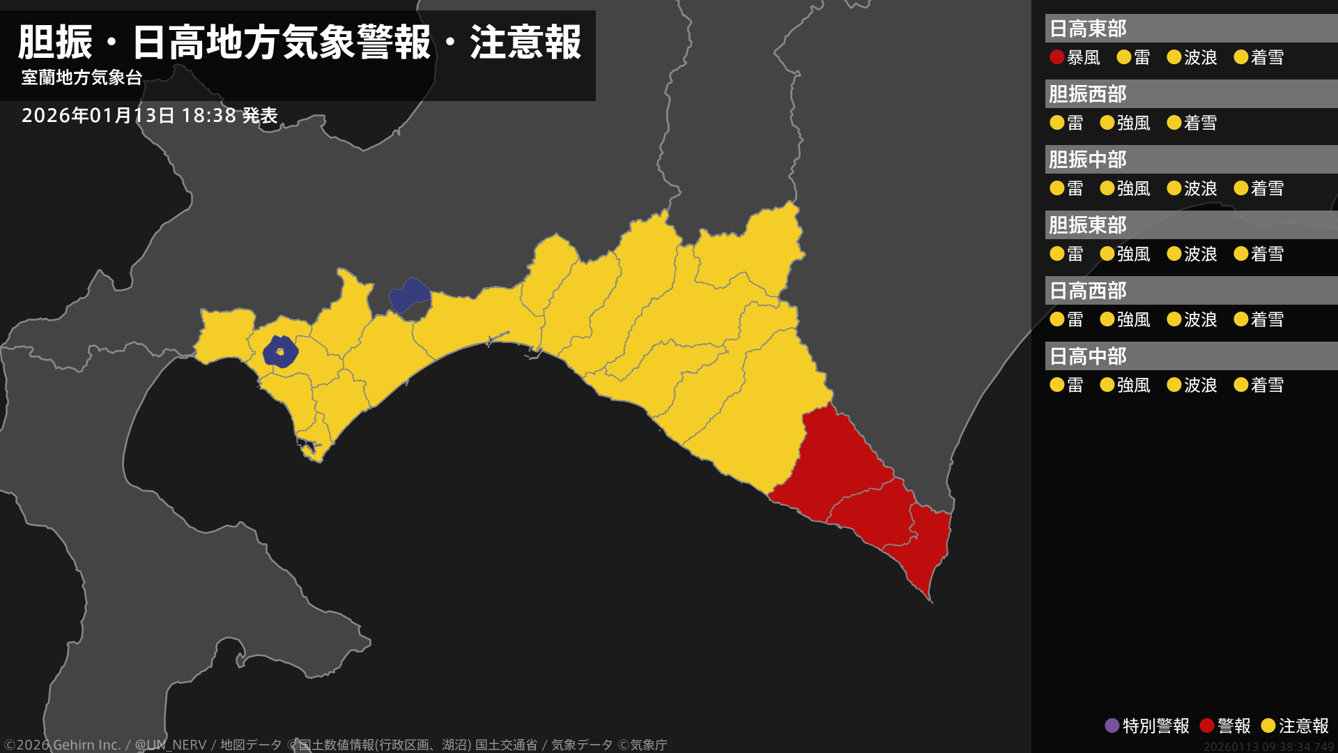 【胆振・日高地方 気象警報・注意報 2026年01月13日 18:38】