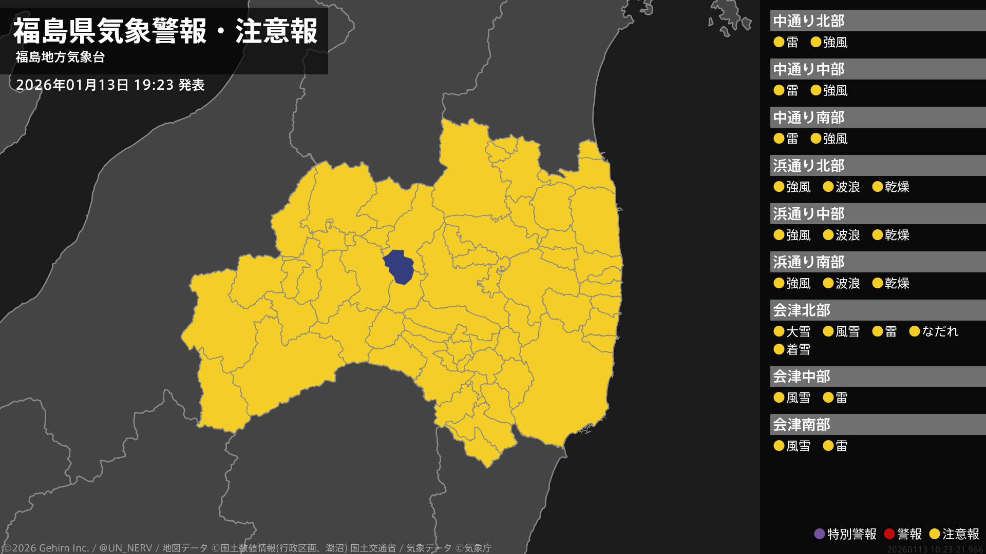 【福島県 気象警報・注意報 2026年01月13日 19:23】