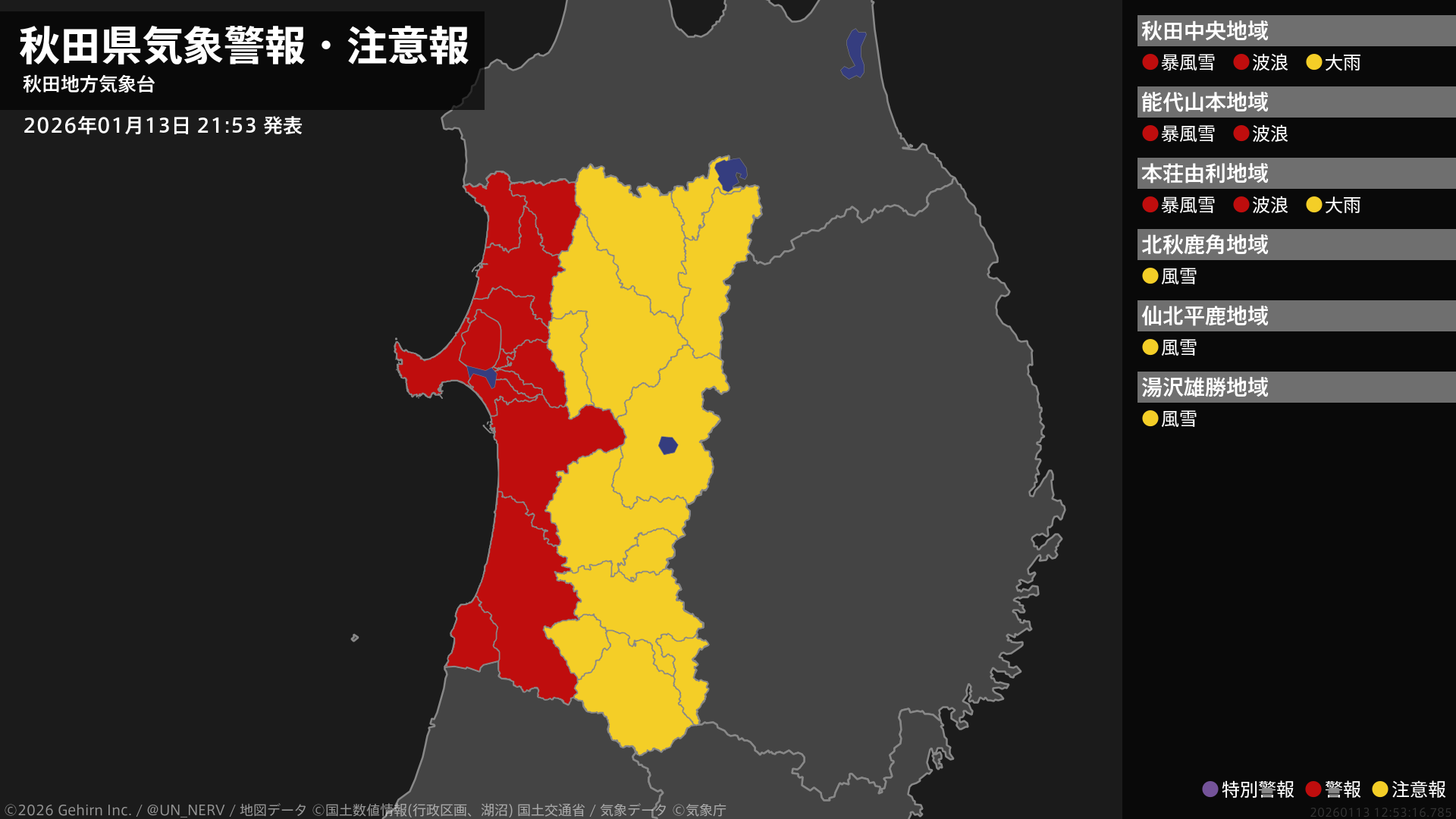 【秋田県 気象警報・注意報 2026年01月13日 21:53】沿岸では、14日明け方まで暴風雪に、14日夕方まで高波に警戒してください。#気象警報注意報 #秋田県