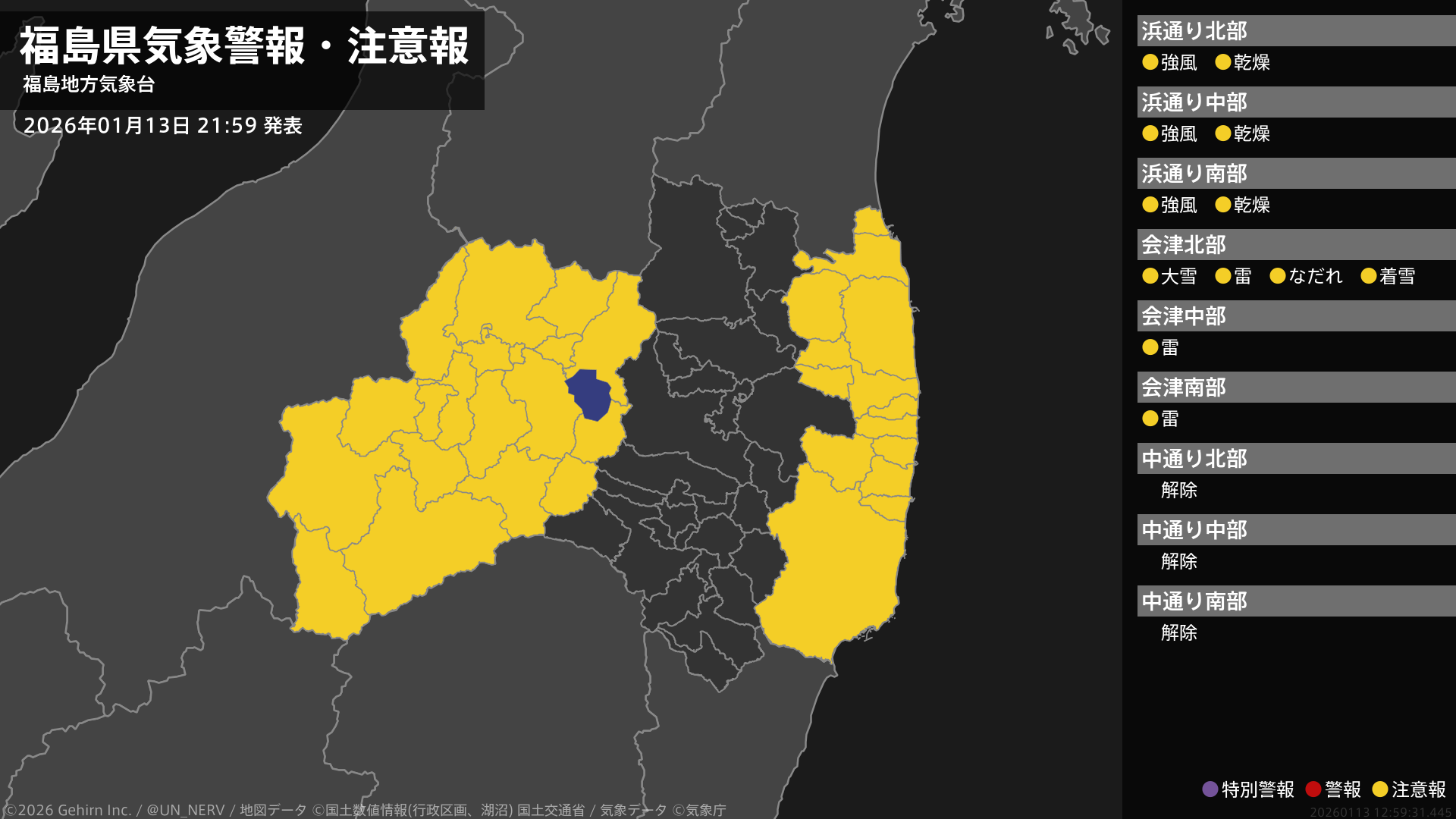 【福島県 気象警報・注意報 2026年01月13日 21:59】浜通りでは、強風と、空気の乾燥した状態が続くため火の取り扱いに注意してください。会津では、大雪や落雷、なだれ、電線等への着雪に注意してください。#気象警報注意報 #福島県