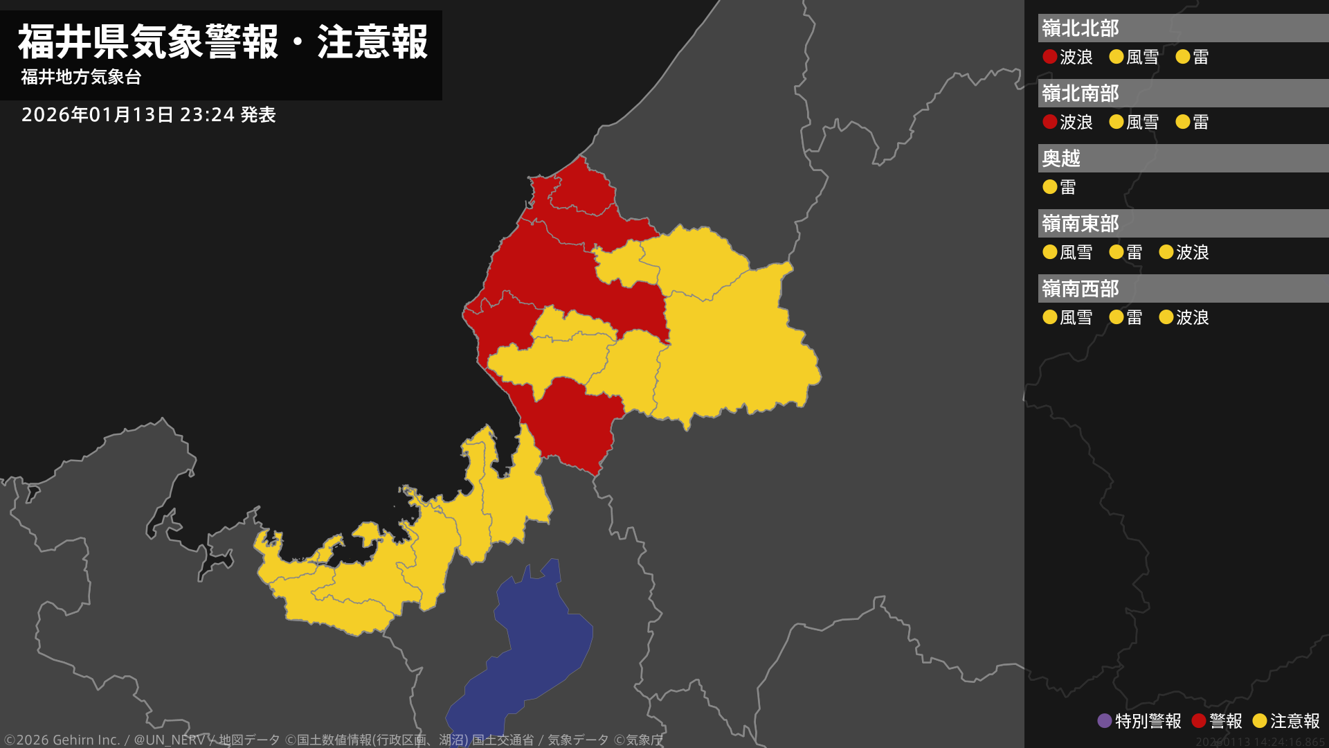【福井県 気象警報・注意報 2026年01月13日 23:24】嶺北では、14日明け方まで高波に警戒してください。#気象警報注意報 #福井県