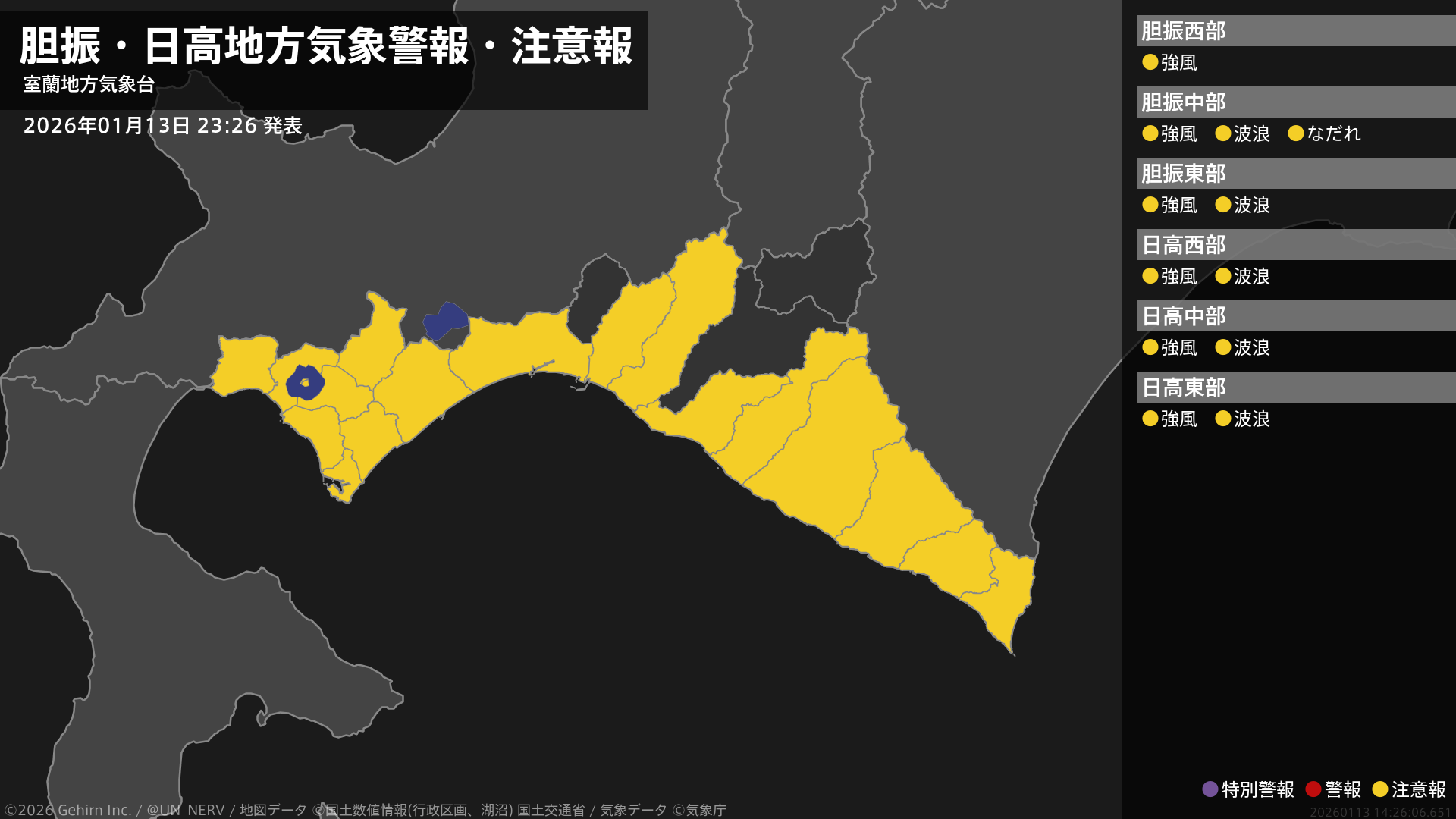 【胆振・日高地方 気象警報・注意報 2026年01月13日 23:26】胆振、日高地方では、強風や高波に注意してください。胆振地方では、なだれに注意してください。#気象警報注意報 #胆振地方 #日高地方