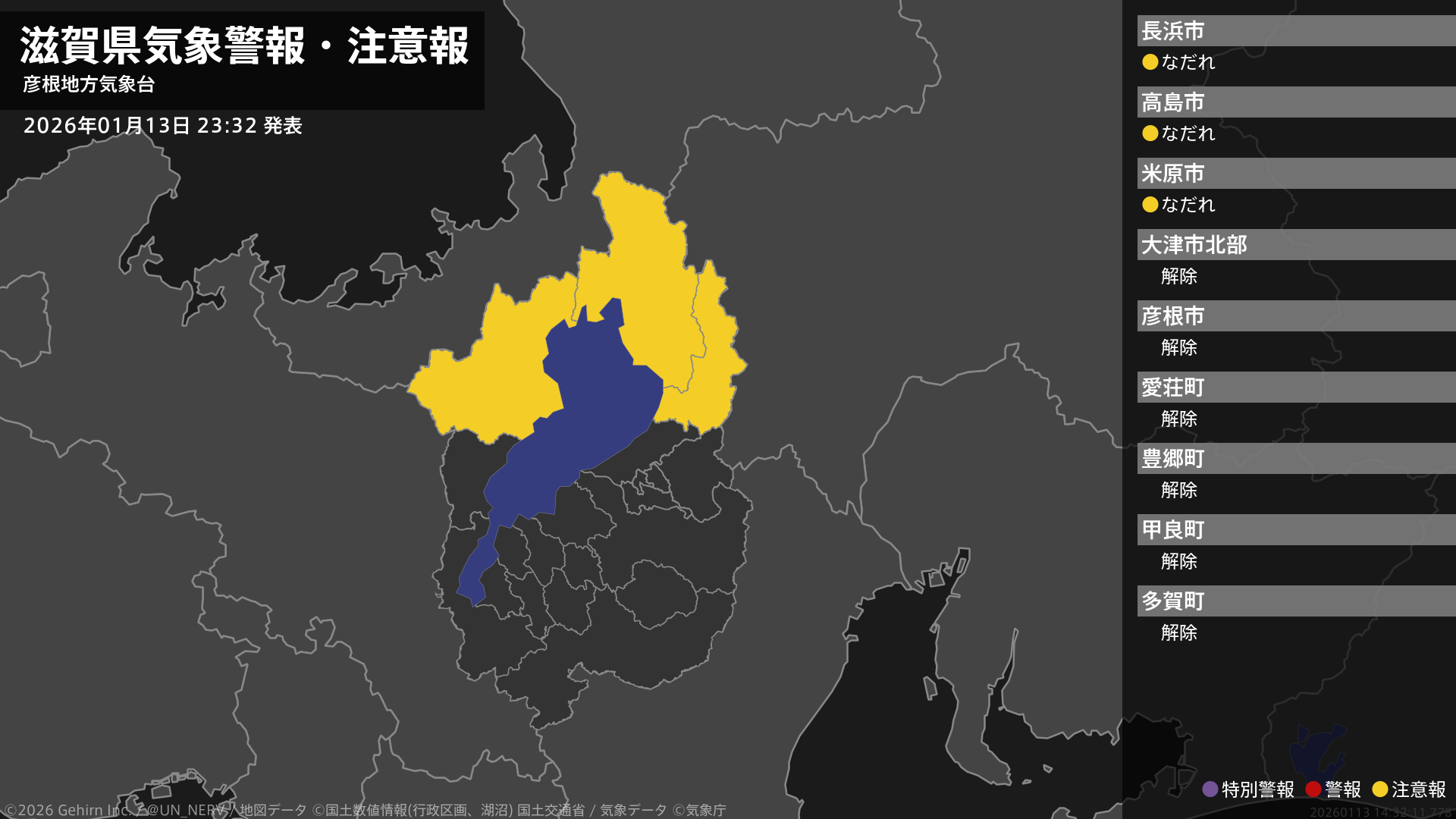 【滋賀県 気象警報・注意報 2026年01月13日 23:32】北部では、15日までなだれに注意してください。#気象警報注意報 #滋賀県