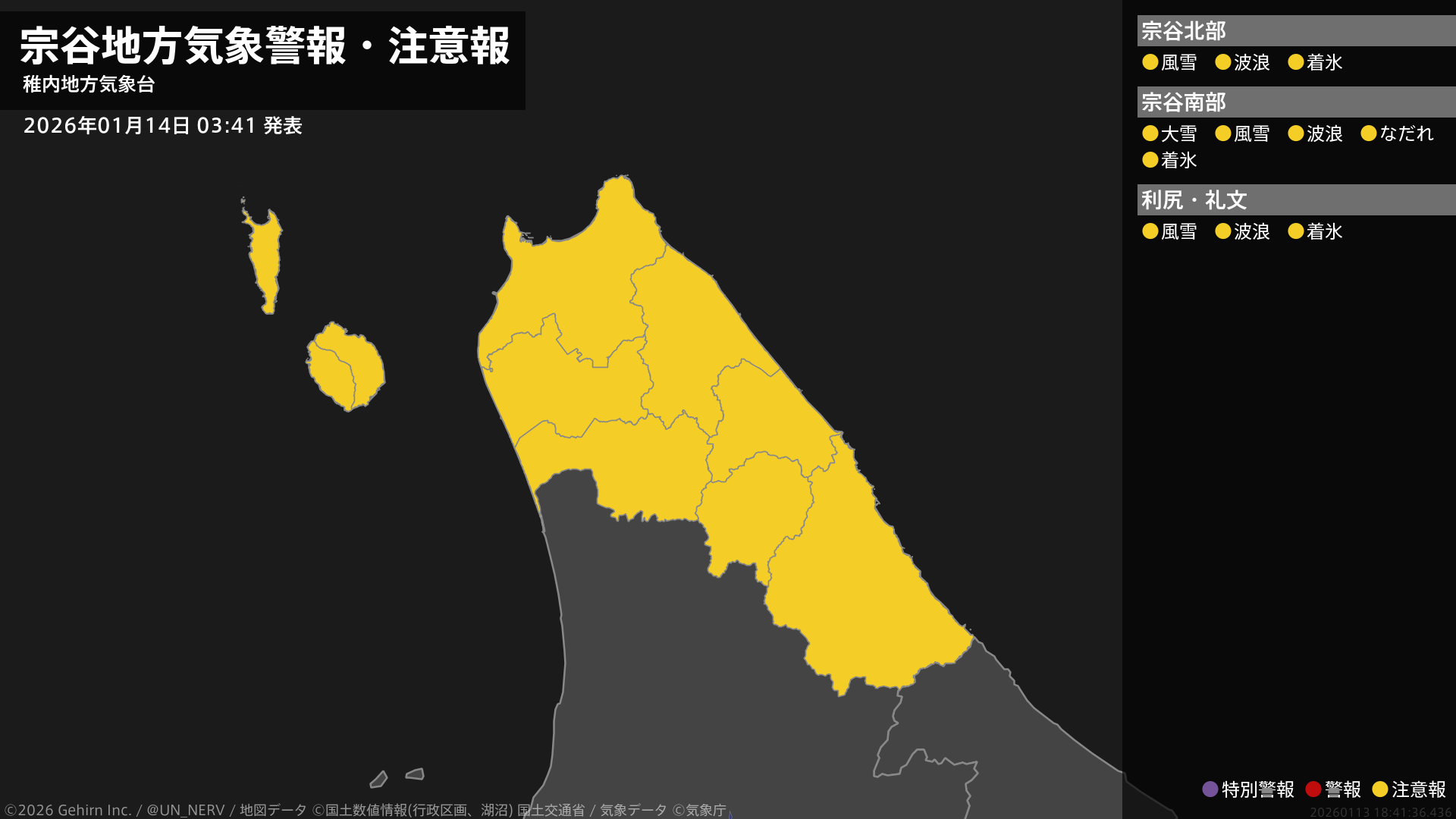 【宗谷地方 気象警報・注意報 2026年01月14日 03:41】宗谷地方では、風雪や大雪、高波、なだれ、着氷に注意してください。#気象警報注意報 #宗谷地方