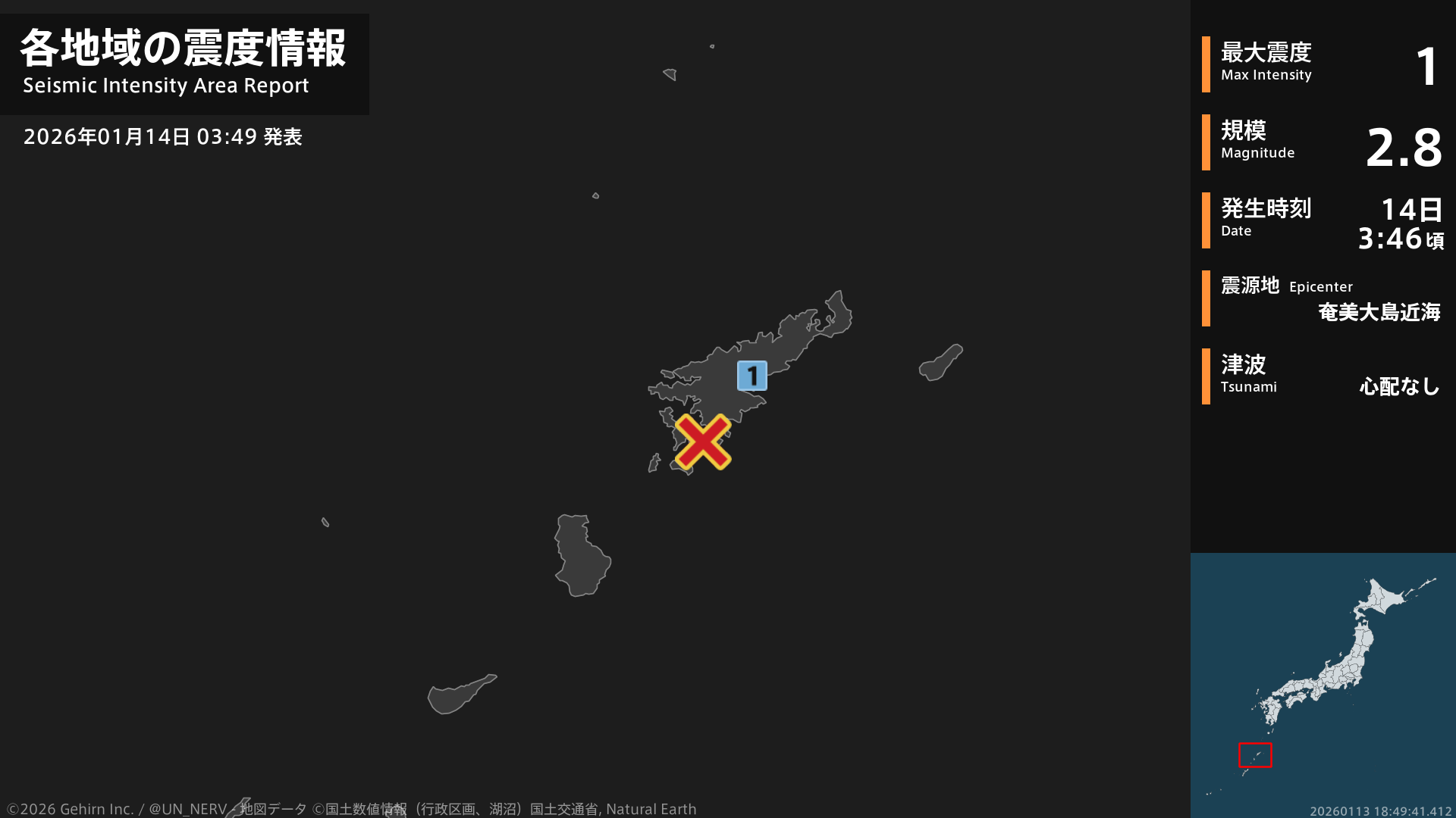 【地震情報 2026年1月14日】3時46分頃、奄美大島近海を震源とする地震がありました。震源の深さは約30km、地震の規模はM2.8、最大震度1を鹿児島県で観測しています。この地震による津波の心配はありません。#地震 #鹿児島県