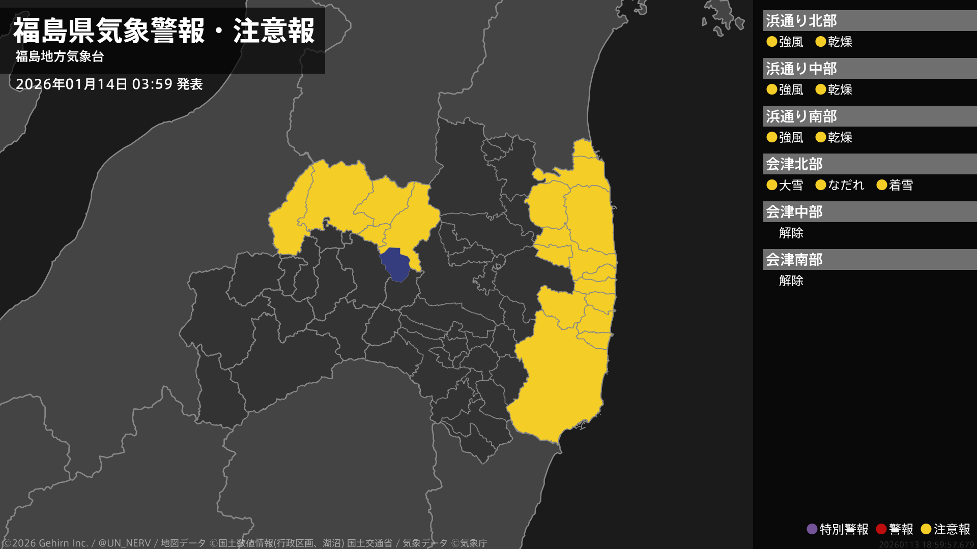 【福島県 気象警報・注意報 2026年01月14日 03:59】浜通りでは、強風と、空気の乾燥した状態が続くため火の取り扱いに注意してください。会津では、大雪やなだれ、電線等への着雪に注意してください。#気象警報注意報 #福島県