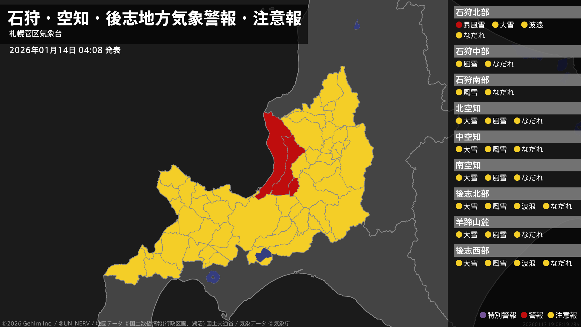 【石狩・空知・後志地方 気象警報・注意報 2026年01月14日 04:08】石狩地方では、15日明け方まで暴風雪に警戒してください。#気象警報注意報 #石狩地方 #空知地方 #後志地方