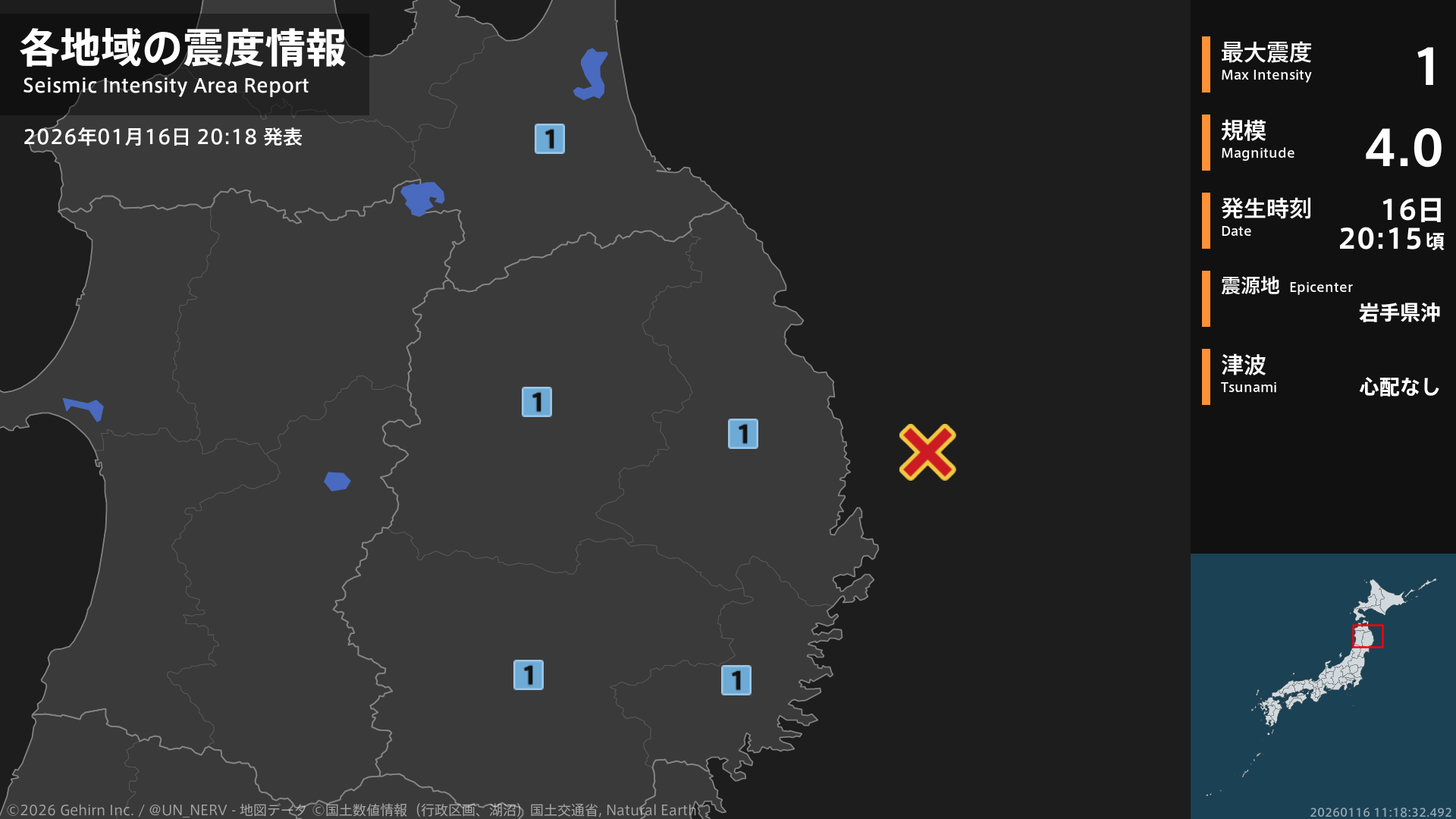 【地震情報 2026年1月16日】20時15分頃、岩手県沖を震源とする地震がありました。震源の深さは約90km、地震の規模はM4.0、最大震度1を青森県、岩手県で観測しています。この地震による津波の心配はありません。#地震 #青森県 #岩手県