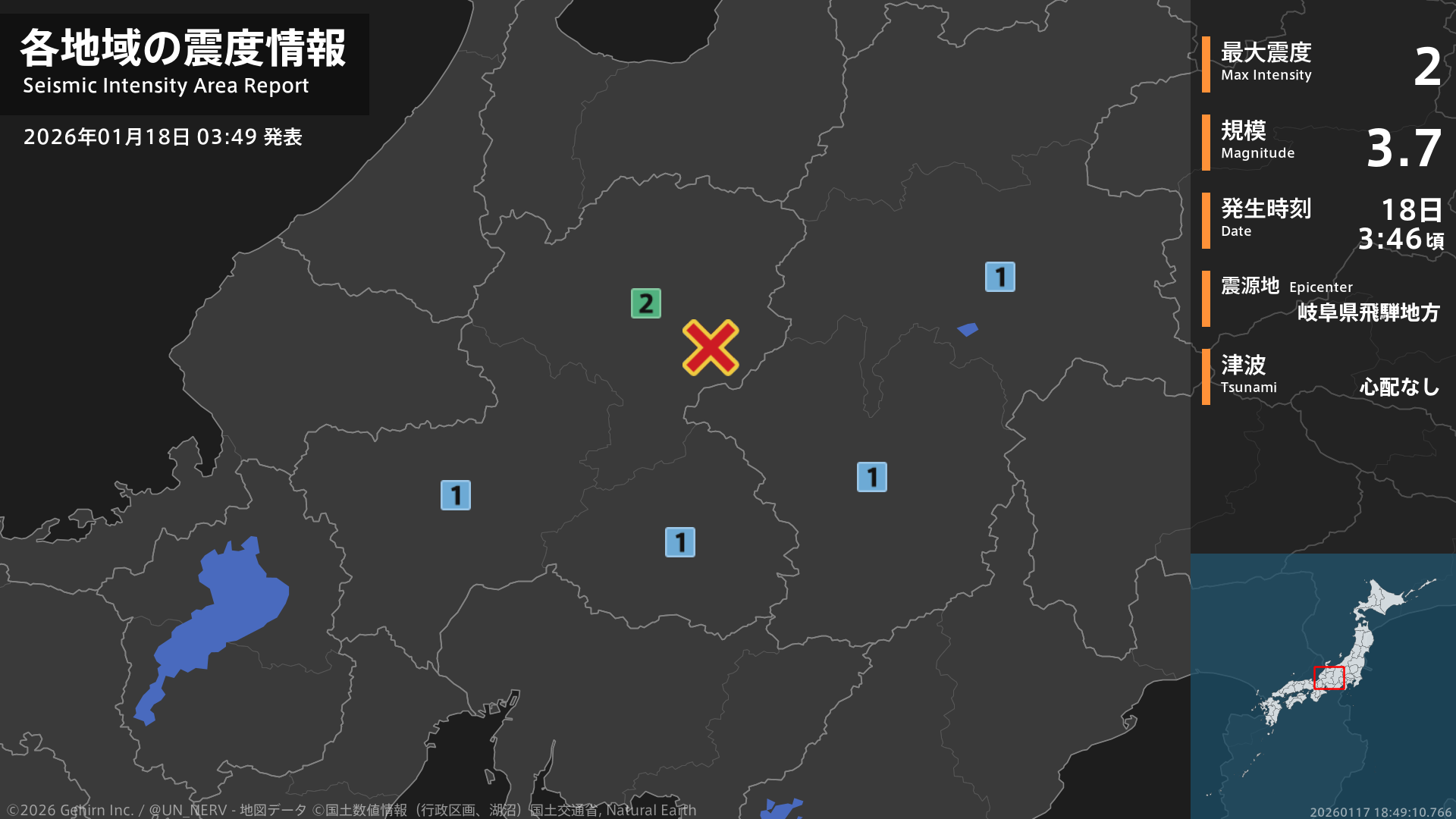 【地震情報 2026年1月18日】3時46分頃、岐阜県飛騨地方を震源とする地震がありました。震源の深さは約10km、地震の規模はM3.7、最大震度2を岐阜県で観測しています。この地震による津波の心配はありません。#地震 #岐阜県 #長野県