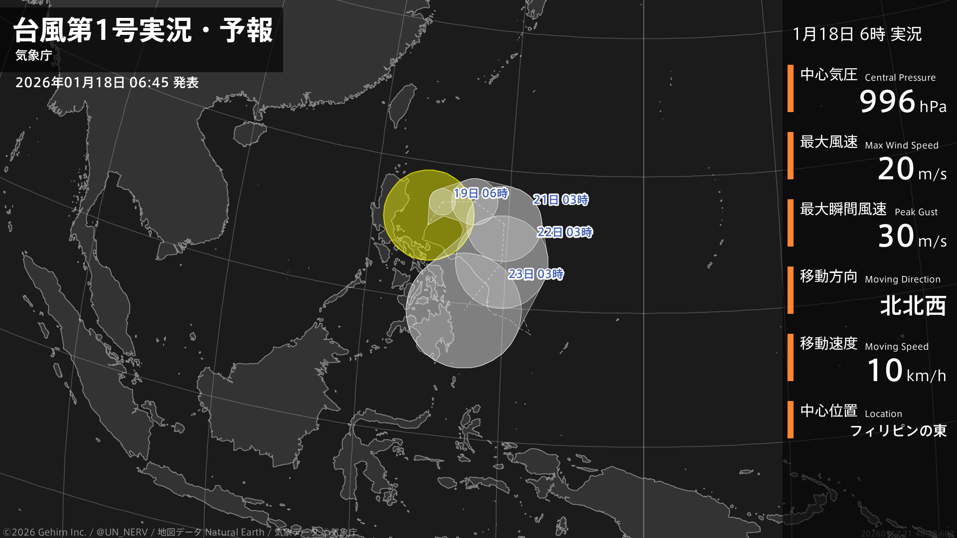 【台風第1号実況・予報 2026年01月18日 06:40】台風第1号(ノケーン)は、フィリピンの東を1時間に10キロの速さで北北西に進んでいます。#台風情報