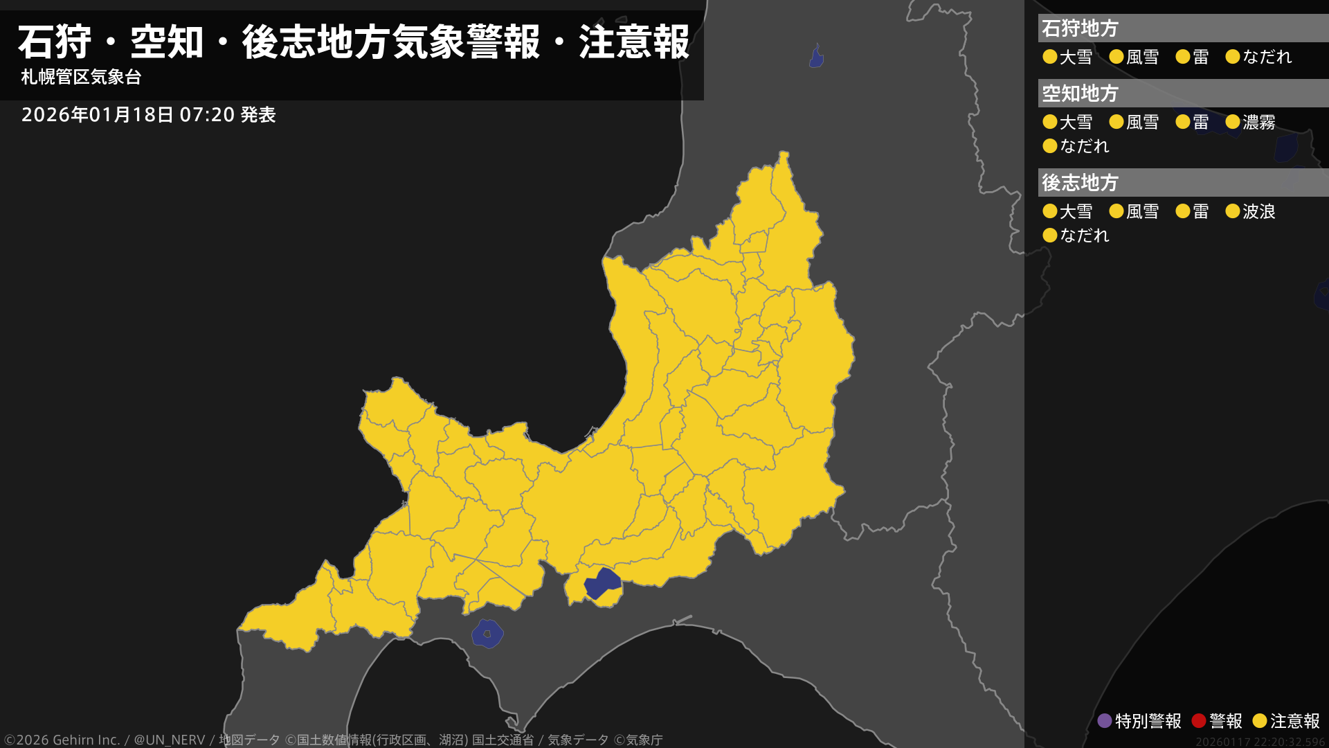 【石狩・空知・後志地方 気象警報・注意報 2026年01月18日 07:20】石狩、空知、後志地方では、風雪や大雪、落雷、なだれに注意してください。後志地方では、高波に注意してください。空知地方では、濃霧による視程障害に注意してください。#気象警報注意報 #石狩地方 #空知地方 #後志地方