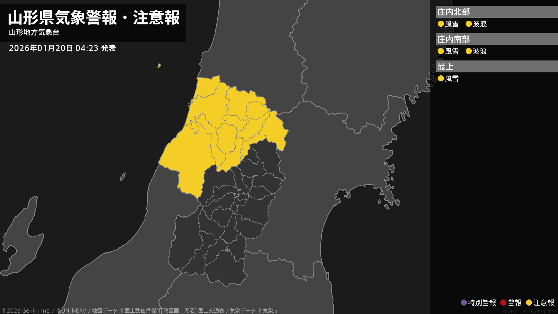 【山形県 気象警報・注意報 2026年01月20日 04:23】庄内、最上では、風雪に注意してください。庄内では、高波に注意してください。#気象警報注意報 #山形県