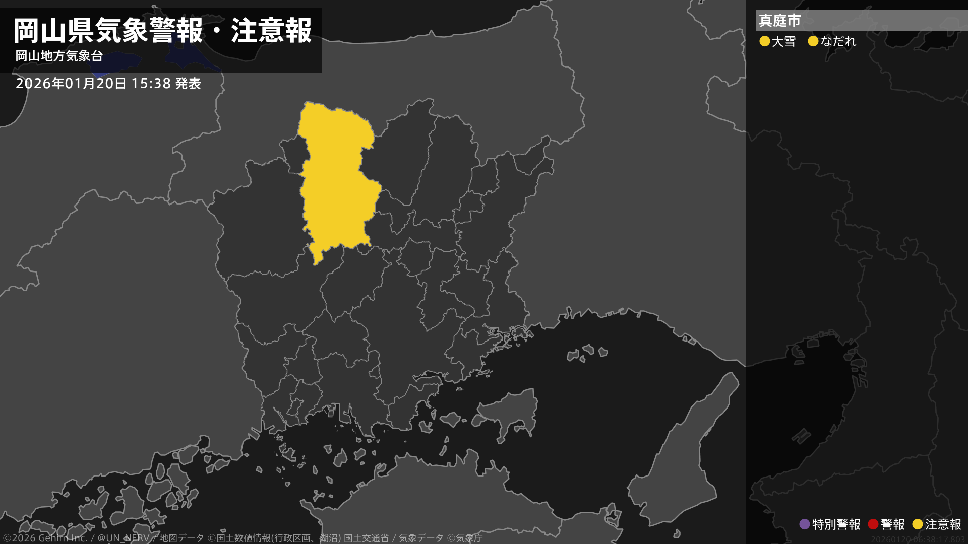 【岡山県 気象警報・注意報 2026年01月20日 15:38】北部では、20日夜遅くまで大雪に、20日までなだれに注意してください。#気象警報注意報 #岡山県