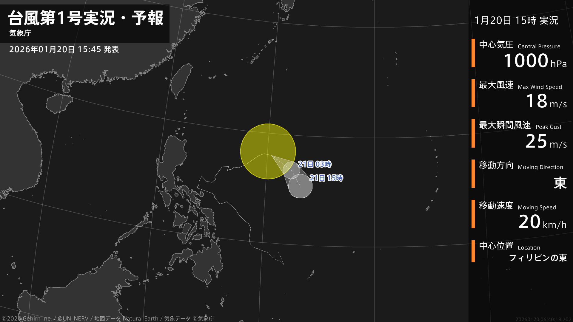 【台風第1号実況・予報 2026年01月20日 15:40】台風第1号(ノケーン)は、フィリピンの東を1時間に20キロの速さで東に進んでいます。#台風情報