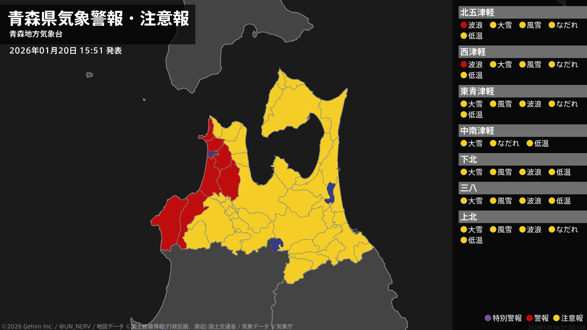 【青森県 気象警報・注意報 2026年01月20日 15:51】津軽では、20日夜のはじめ頃まで高波に警戒してください。#気象警報注意報 #青森県