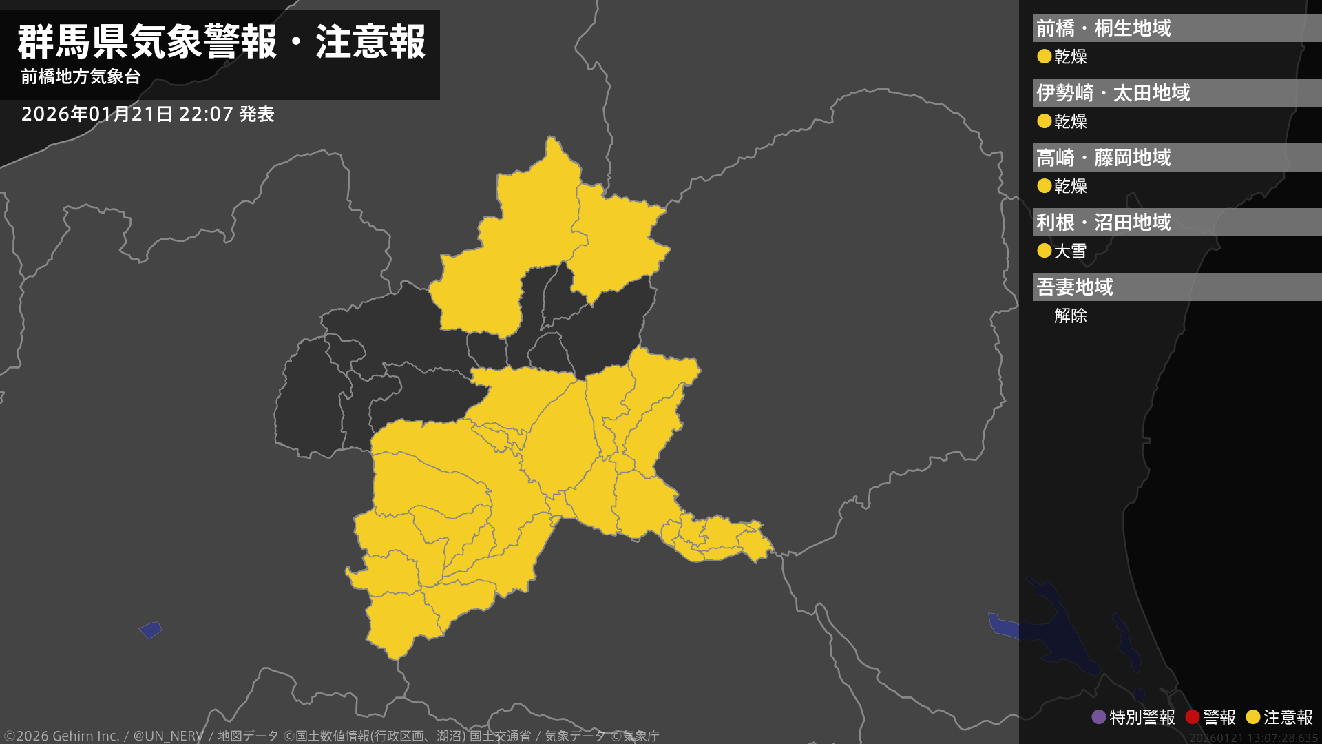 【群馬県 気象警報・注意報 2026年01月21日 22:07】北部では、22日明け方から22日昼前まで大雪に注意してください。南部では、23日まで空気の乾燥した状態が続くため、火の取り扱いに注意してください。#気象警報注意報 #群馬県