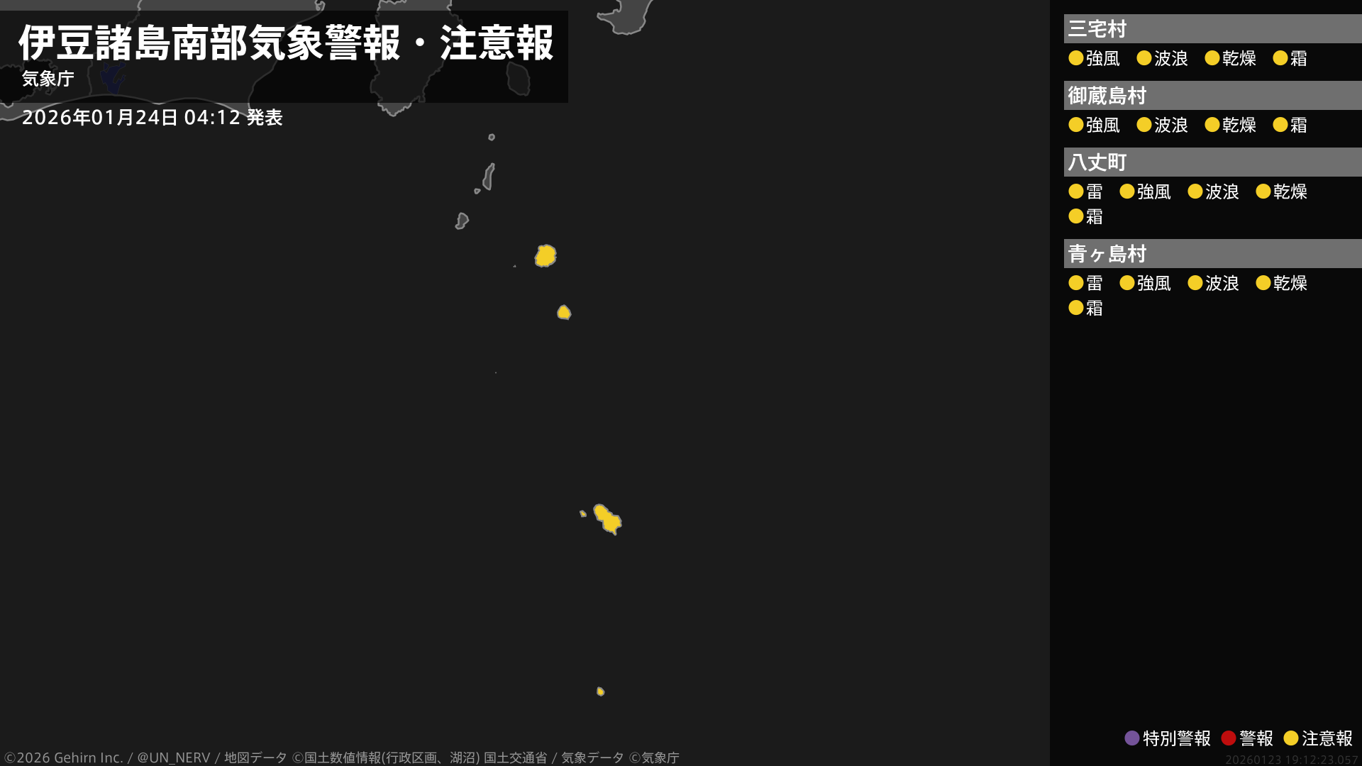 【東京都 気象警報・注意報 2026年01月24日 04:12】東京都では、強風や高波、竜巻などの激しい突風、急な強い雨、落雷と、空気の乾燥した状態が続くため火の取り扱い、霜に対する農作物の管理に注意してください。#気象警報注意報 #東京都