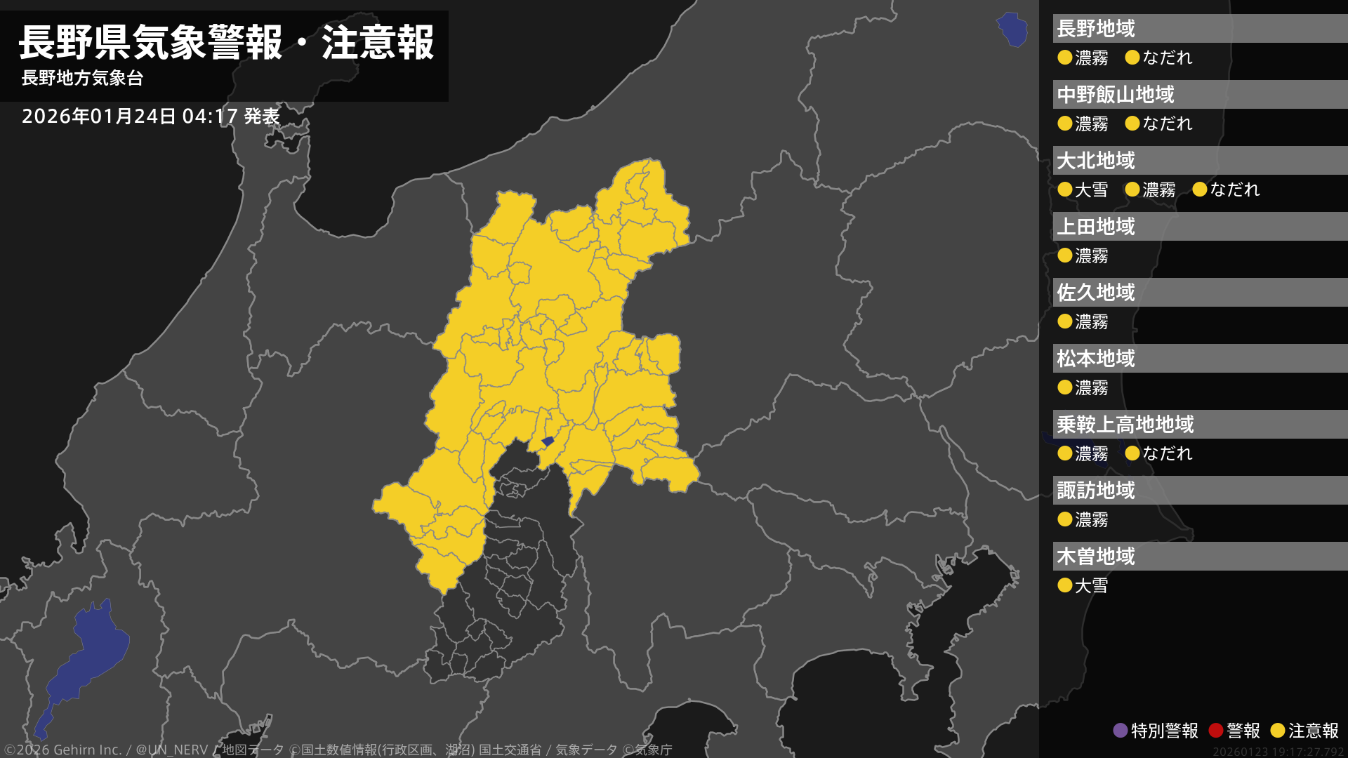 【長野県 気象警報・注意報 2026年01月24日 04:17】北部では24日朝から、南部では24日昼過ぎから、大雪に注意してください。北部、中部では、24日昼前まで濃霧による視程障害に、26日までなだれに注意してください。#気象警報注意報 #長野県