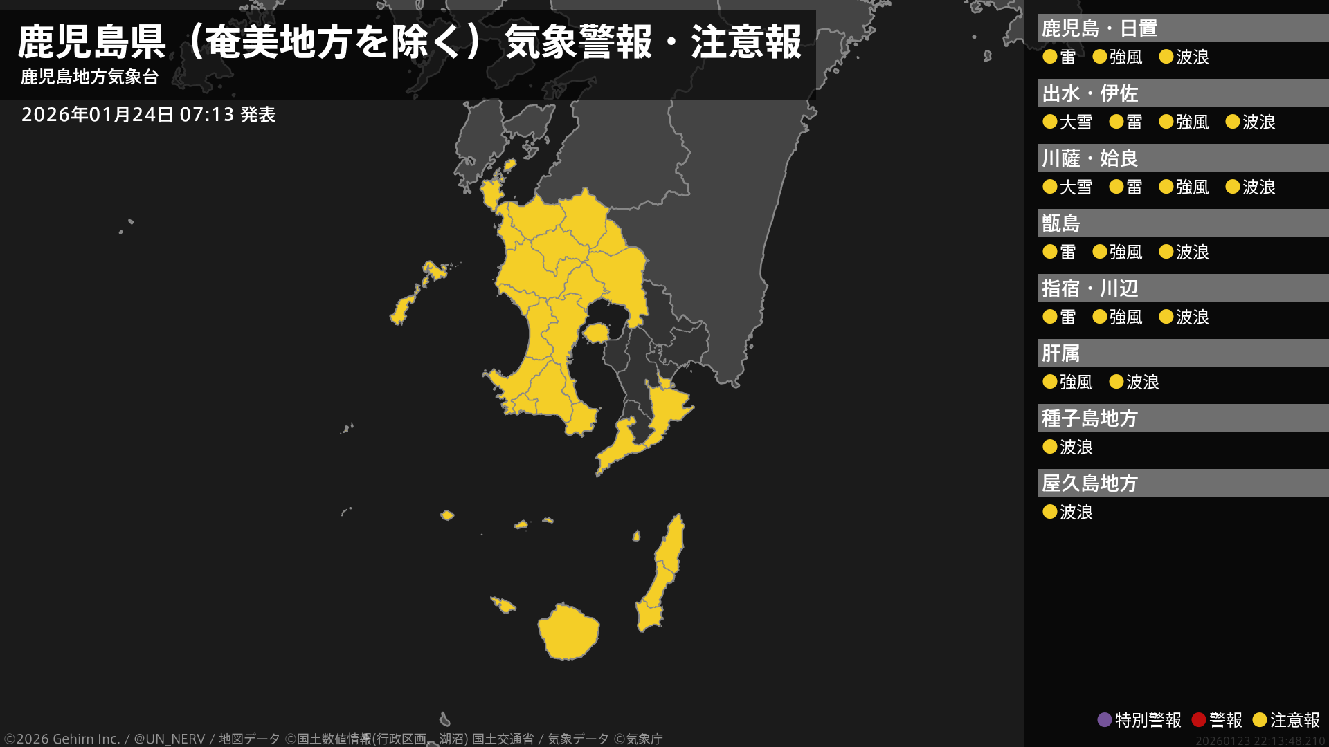 【鹿児島県(奄美地方を除く) 気象警報・注意報 2026年01月24日 07:13】