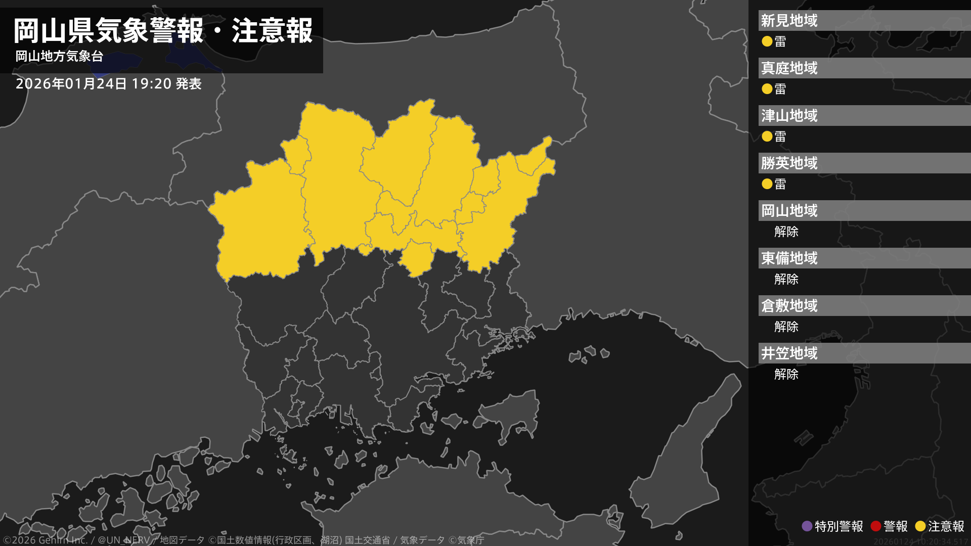 【岡山県 気象警報・注意報 2026年01月24日 19:20】