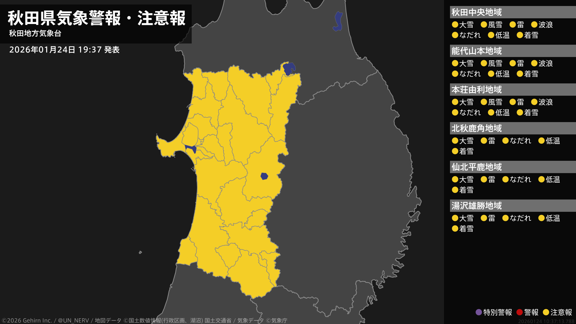 【秋田県 気象警報・注意報 2026年01月24日 19:37】