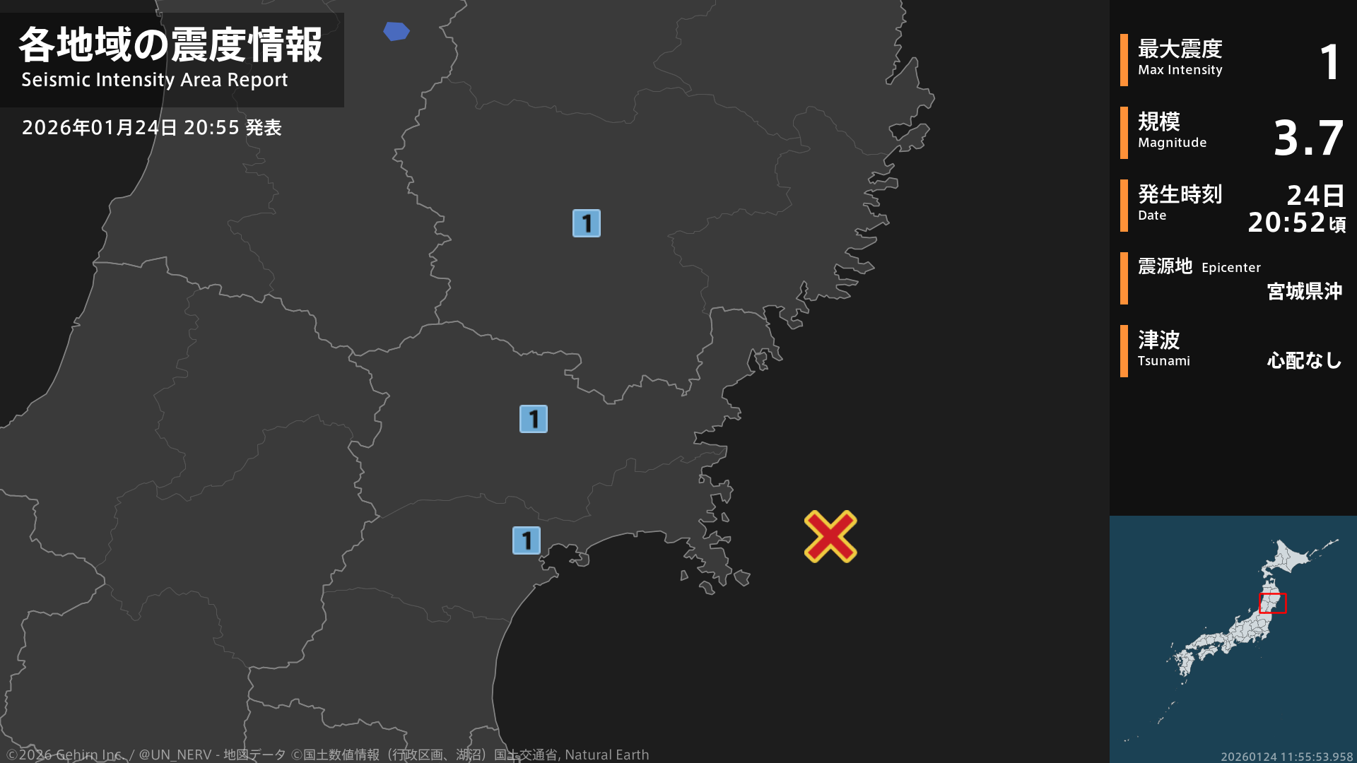 20時52分頃、宮城県沖を震源とする地震がありました。震源の深さは約60km、地震の規模はM3.7、最大震度1を岩手県、宮城県で観測しています。この地震による津波の心配はありません。