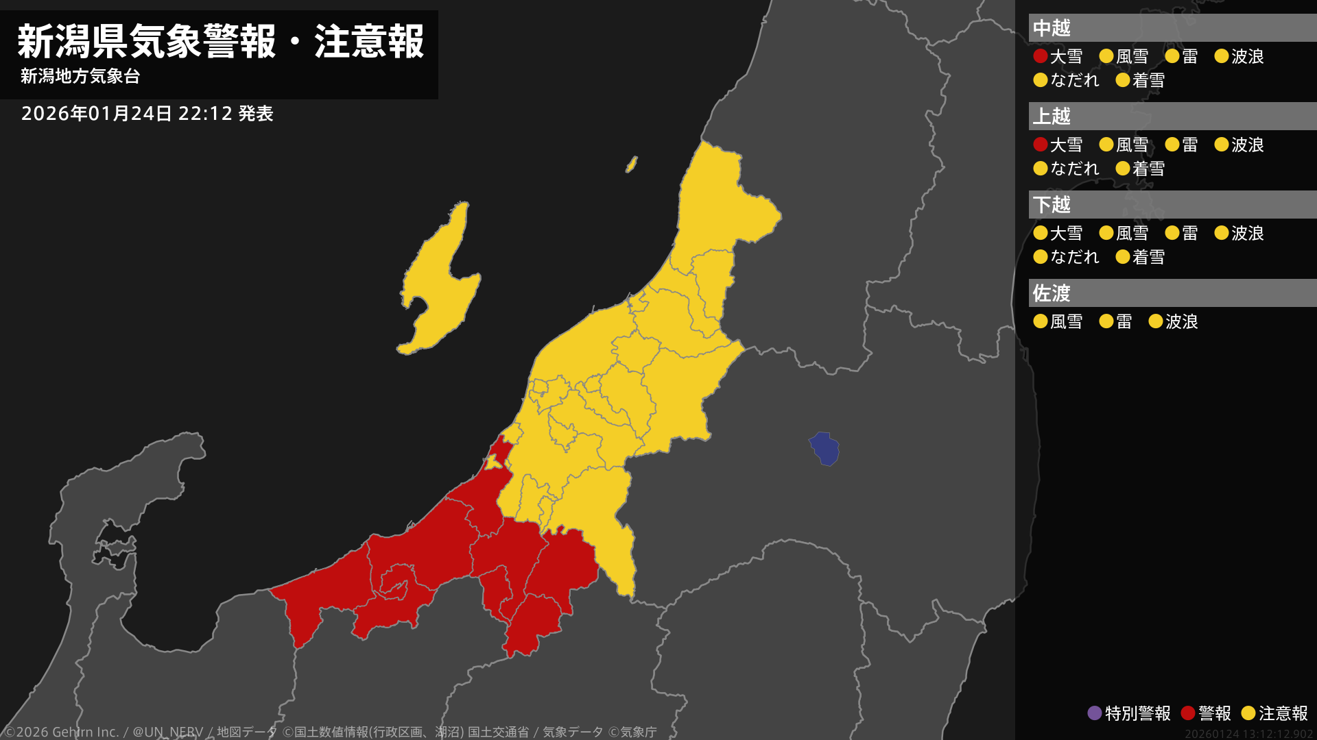 【新潟県 気象警報・注意報 2026年01月24日 22:12】