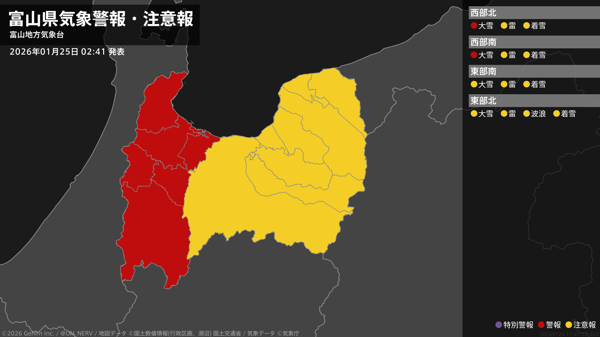 【富山県 気象警報・注意報 2026年01月25日 02:41】西部では、25日朝まで大雪に警戒してください。#気象警報注意報 #富山県