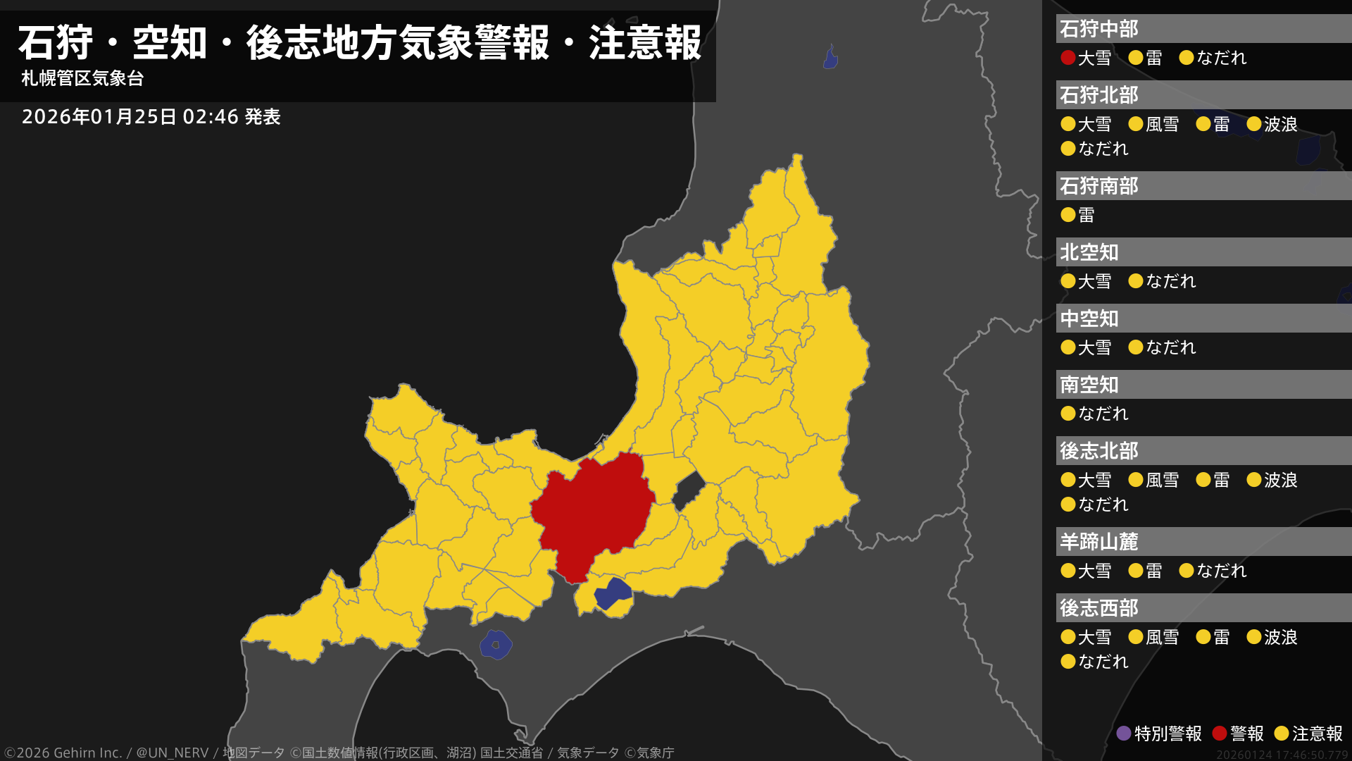 【石狩・空知・後志地方 気象警報・注意報 2026年01月25日 02:46】石狩地方では、25日昼前まで大雪に警戒してください。#気象警報注意報 #石狩地方 #空知地方 #後志地方