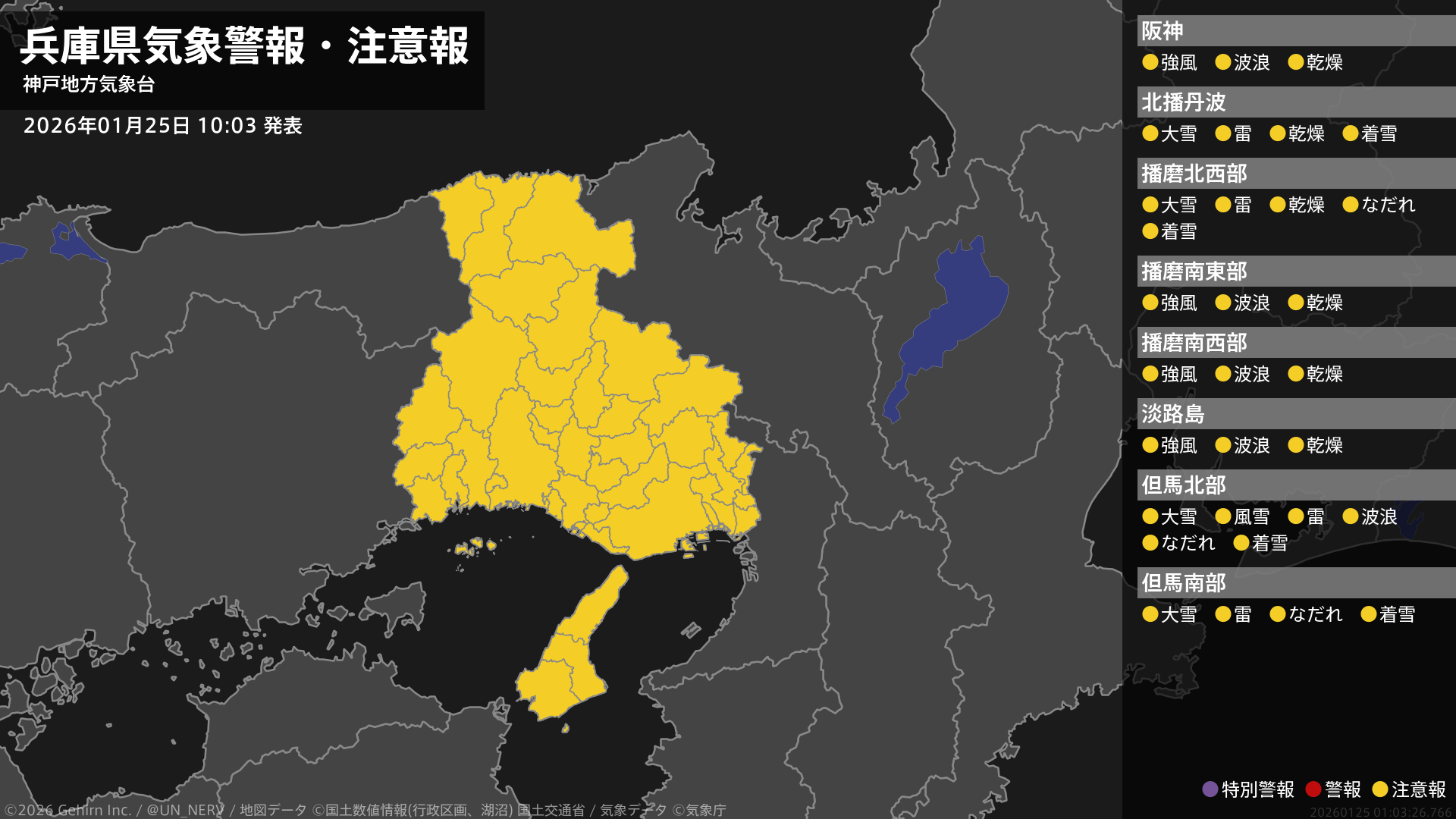 【兵庫県 気象警報・注意報 2026年01月25日 10:03】南部では強風と、空気の乾燥した状態が続くため火の取り扱いに、北部では風雪に、兵庫県では大雪や高波、竜巻などの激しい突風、落雷、なだれ、電線等への着雪に注意してください。#気象警報注意報 #兵庫県