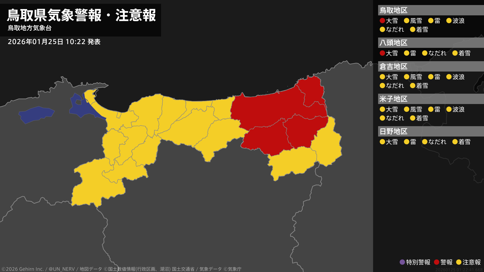 【鳥取県 気象警報・注意報 2026年01月25日 10:22】東部では、25日昼過ぎまで大雪に警戒してください。#気象警報注意報 #鳥取県