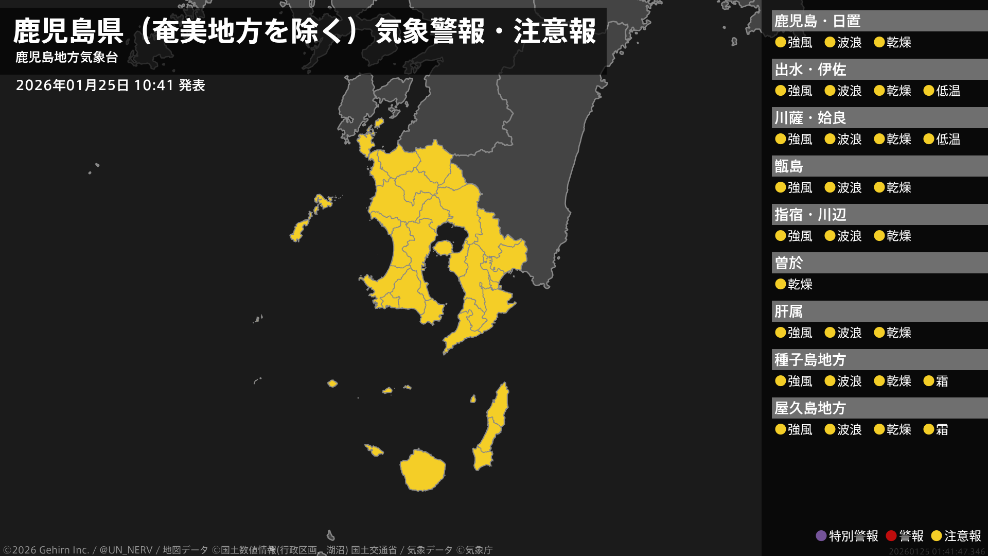 【鹿児島県(奄美地方を除く) 気象警報・注意報 2026年01月25日 10:41】