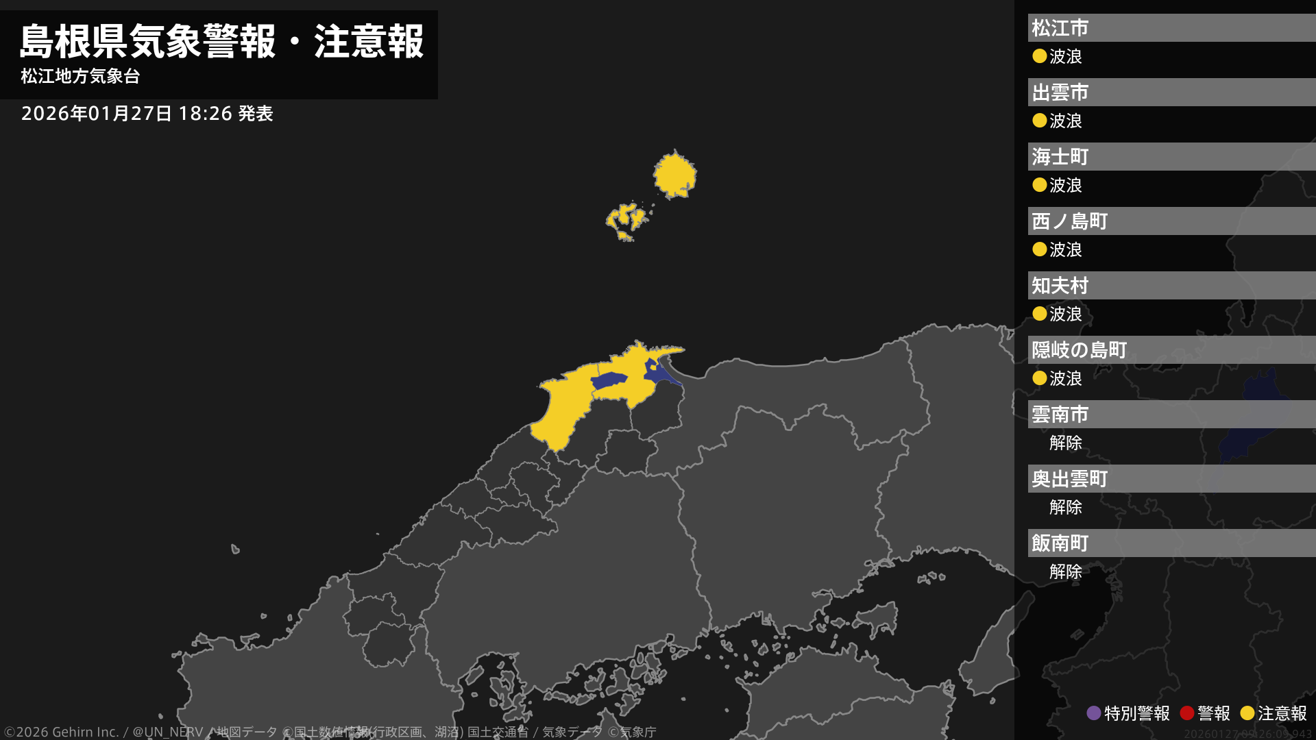 【島根県 気象警報・注意報 2026年01月27日 18:26】東部、隠岐では、28日昼前まで高波に注意してください。#気象警報注意報 #島根県