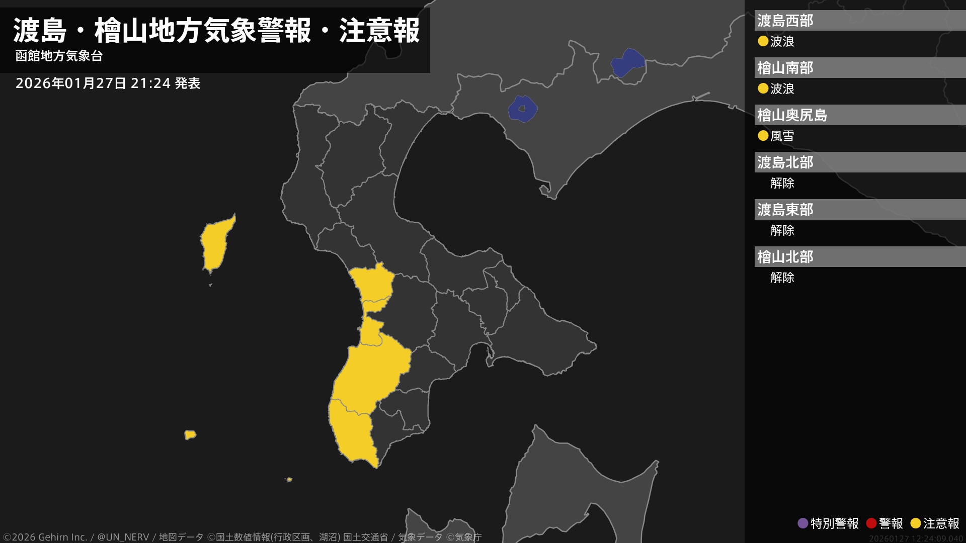 【渡島・檜山地方 気象警報・注意報 2026年01月27日 21:24】檜山地方では、28日未明から28日朝まで風雪に注意してください。檜山地方では28日未明から28日夕方まで、渡島地方では28日未明から28日夜遅くまで、高波に注意してください。#気象警報注意報 #渡島地方 #檜山地方