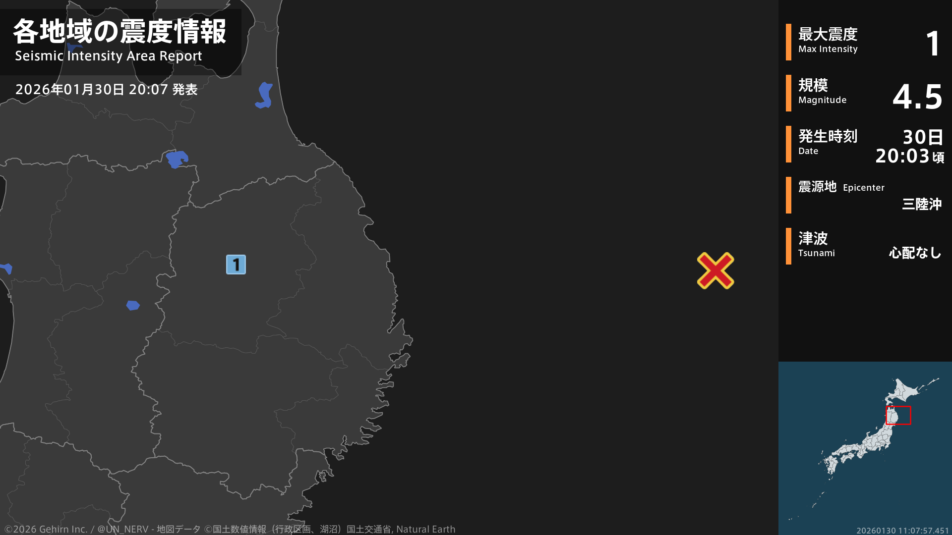 【地震情報 2026年1月30日】20時3分頃、三陸沖を震源とする地震がありました。震源の深さは約10km、地震の規模はM4.5、最大震度1を岩手県で観測しています。この地震による津波の心配はありません。#地震 #岩手県
