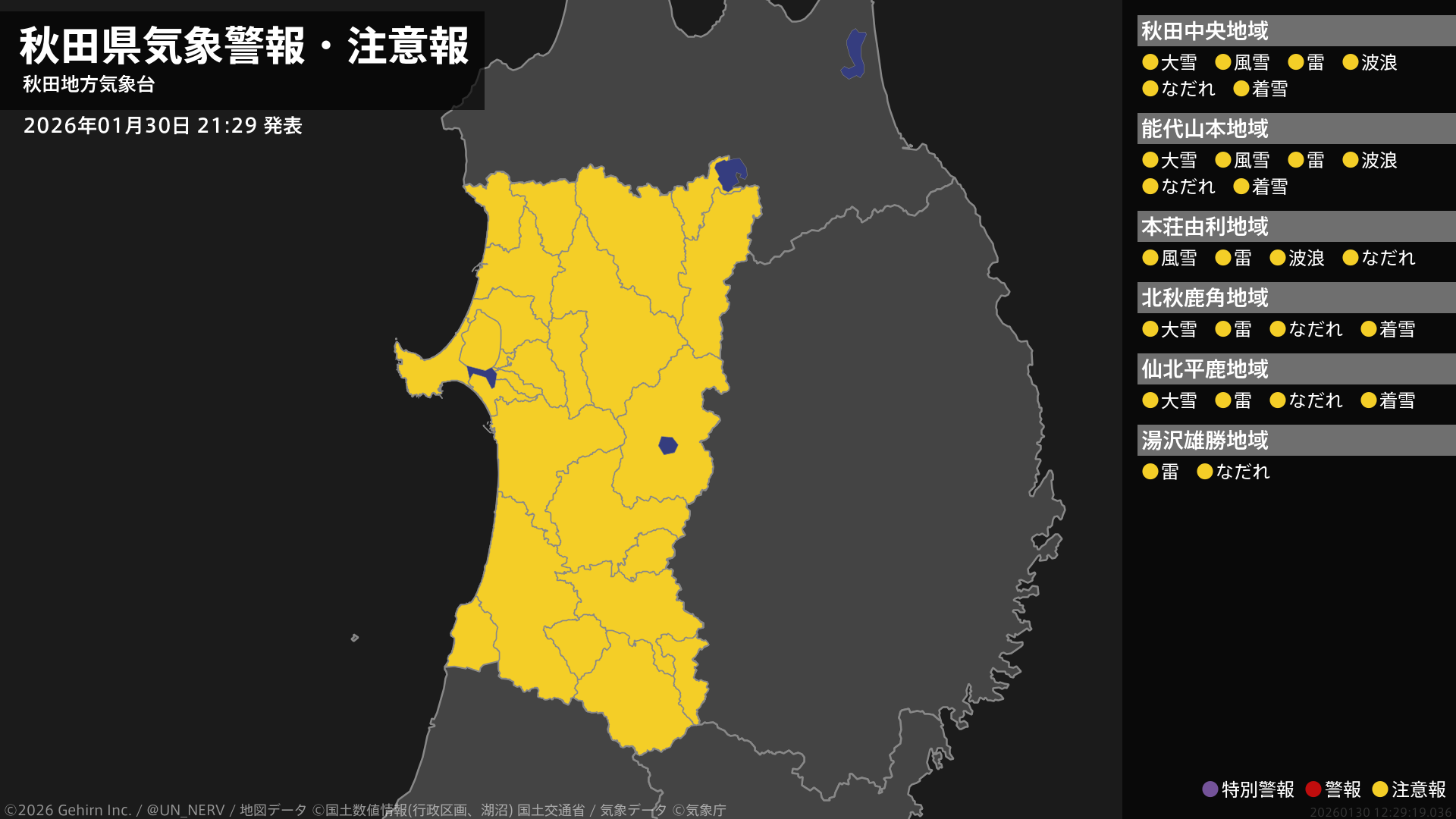 【秋田県 気象警報・注意報 2026年01月30日 21:29】沿岸では、風雪や高波に注意してください。秋田県では、大雪や落雷、なだれ、電線等への着雪に注意してください。#気象警報注意報 #秋田県