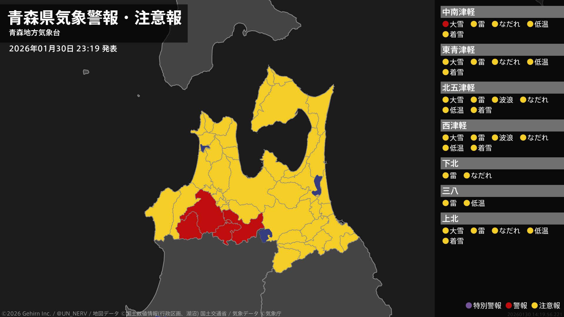 【青森県 気象警報・注意報 2026年01月30日 23:19】津軽では、31日未明まで大雪に警戒してください。#気象警報注意報 #青森県