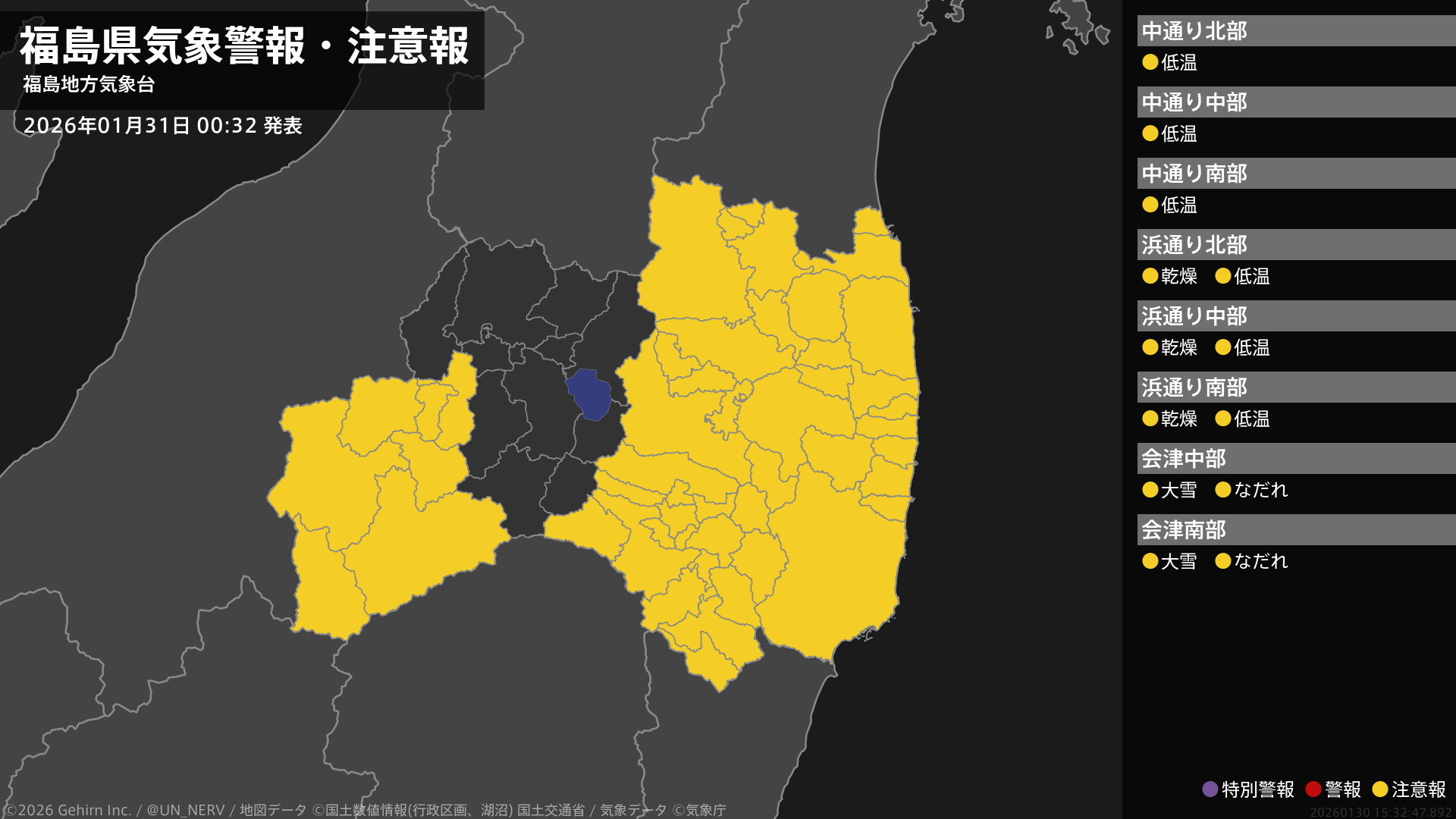 【福島県 気象警報・注意報 2026年01月31日 00:32】会津では、大雪やなだれに注意してください。浜通りでは、空気の乾燥した状態が続くため、火の取り扱いに注意してください。中通り、浜通りでは、低温に注意してください。#気象警報注意報 #福島県