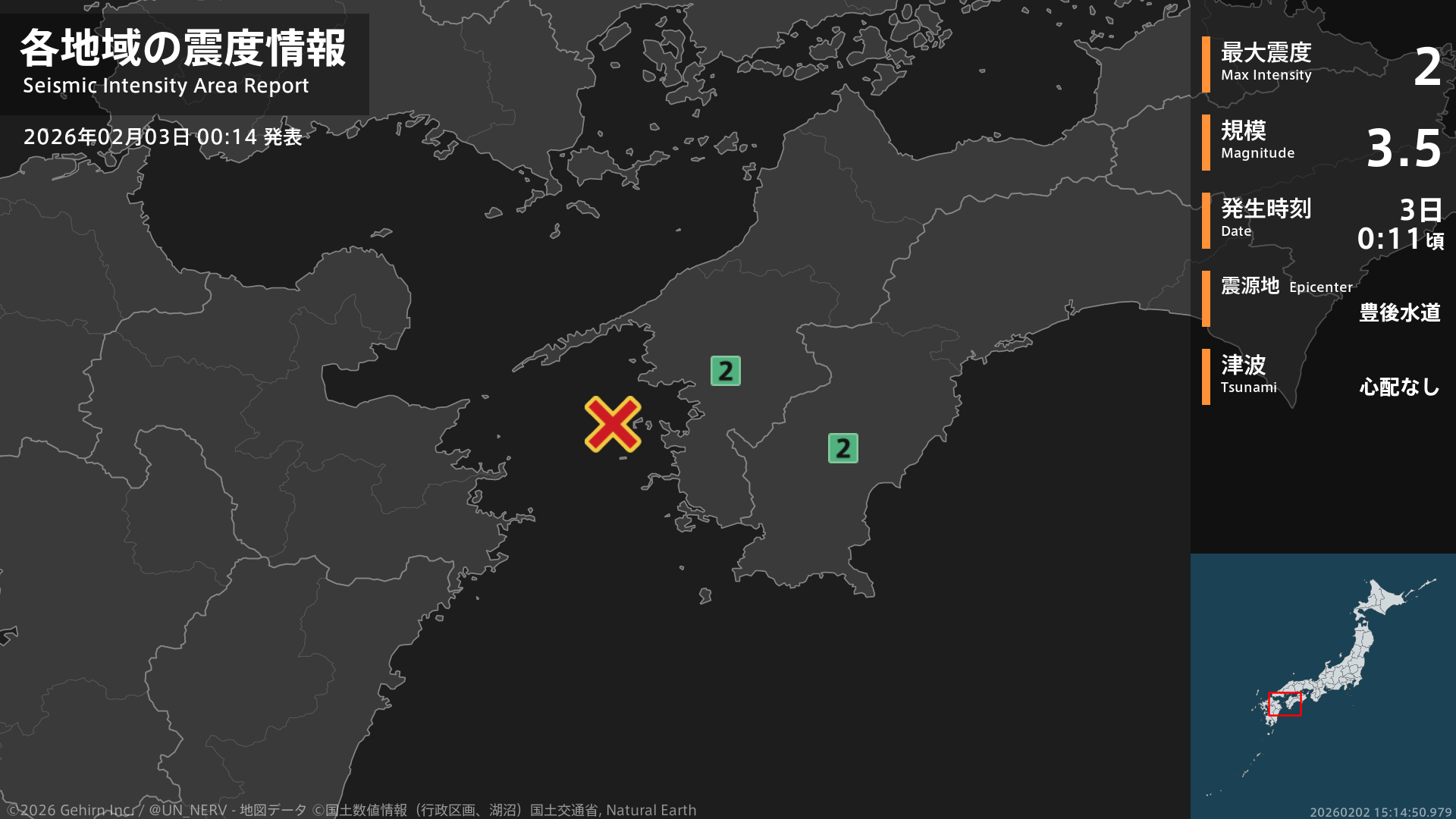 【地震情報 2026年2月3日】0時11分頃、豊後水道を震源とする地震がありました。震源の深さは約40km、地震の規模はM3.5、最大震度2を愛媛県、高知県で観測しています。この地震による津波の心配はありません。#地震 #愛媛県 #高知県
