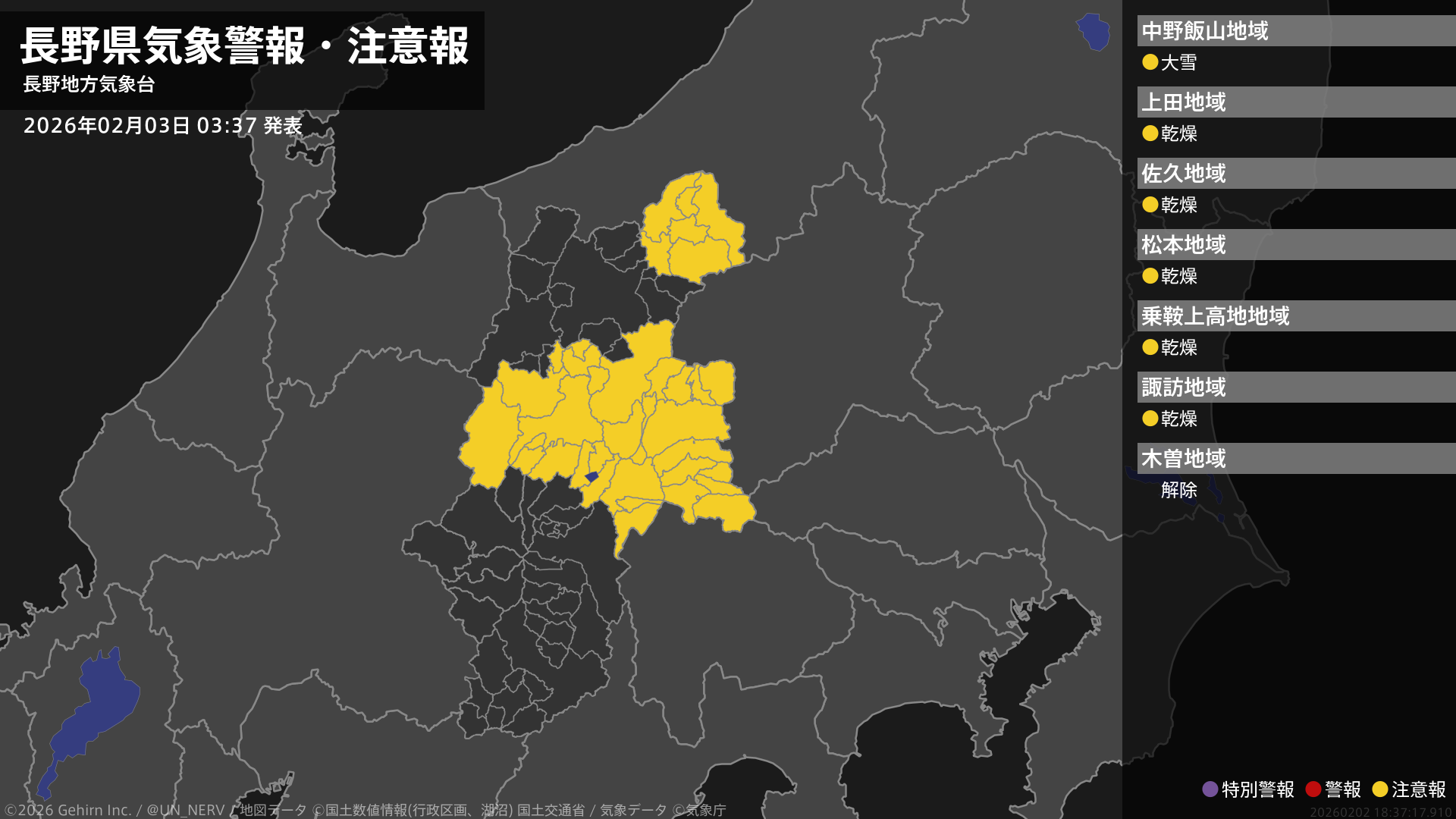 【長野県 気象警報・注意報 2026年02月03日 03:37】北部では、3日昼前まで大雪に注意してください。中部では、4日まで空気の乾燥した状態が続くため、火の取り扱いに注意してください。#気象警報注意報 #長野県