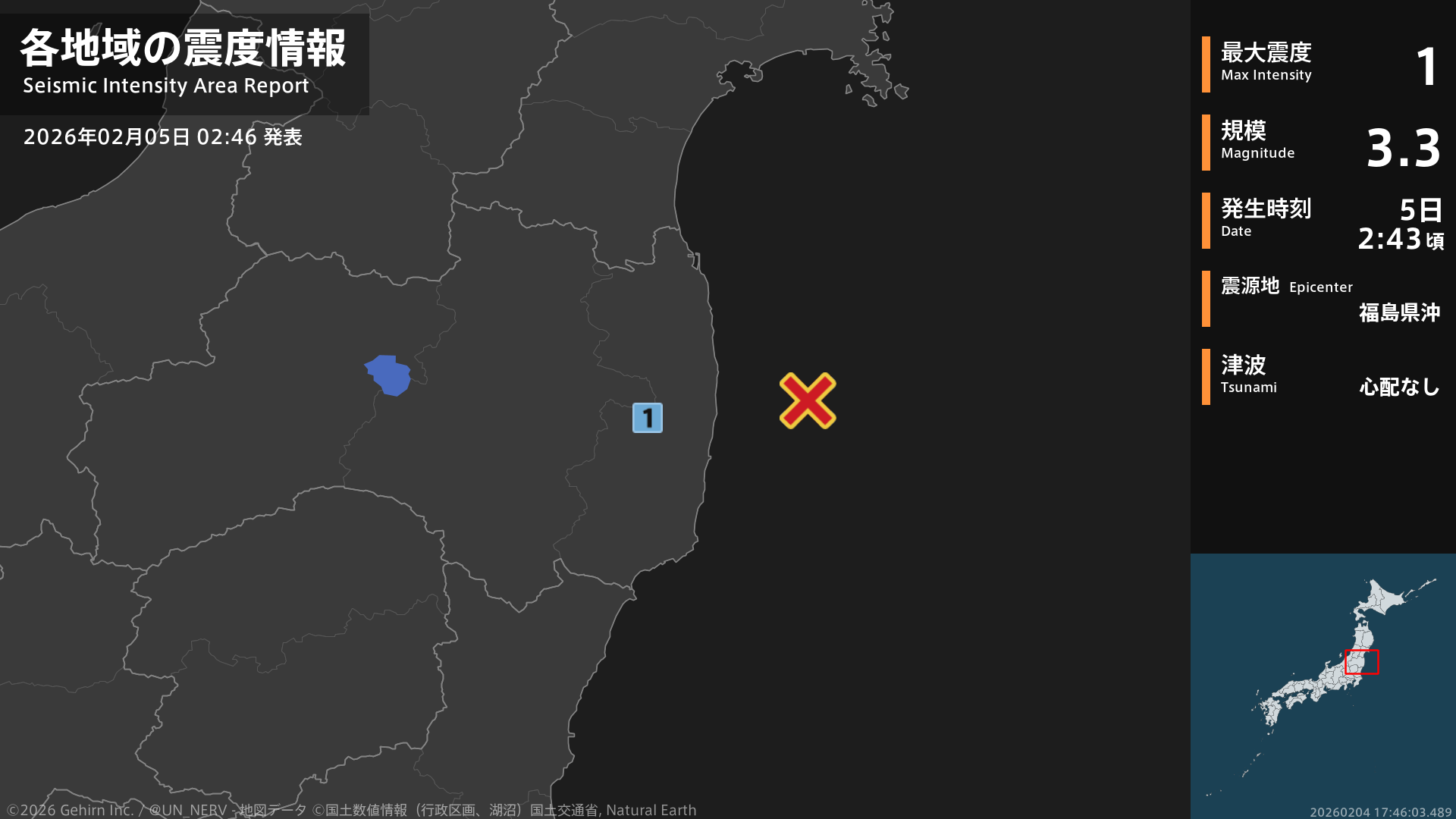 3時20分頃、奄美大島北東沖を震源とする地震がありました。地震の規模はM5.5程度、最大震度3程度と推定されています。この情報は気象庁の予報に基づく推定です。情報は誤差を含む場合があります。