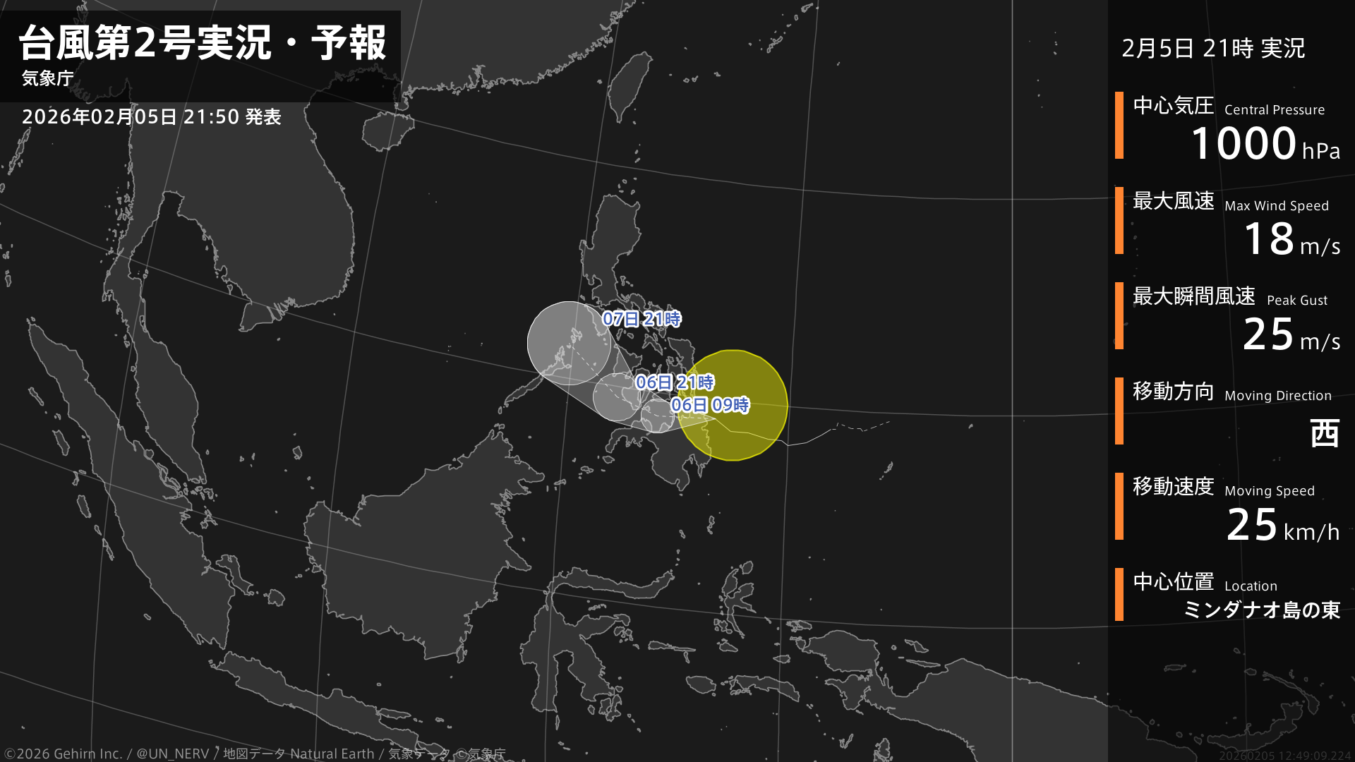 【台風第2号実況・予報 2026年02月05日 21:49】台風第2号(ペンニャ)は、ミンダナオ島の東を1時間に25キロの速さで西に進んでいます。#台風情報