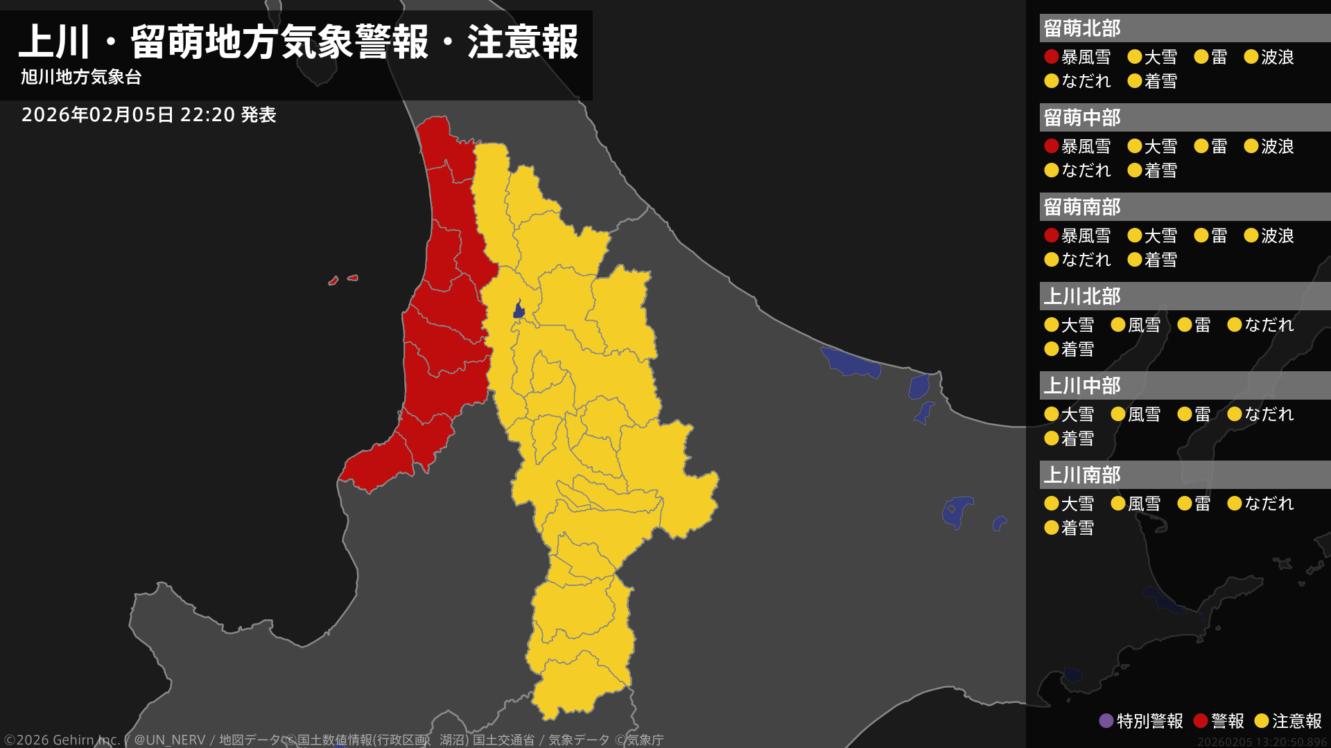 【上川・留萌地方 気象警報・注意報 2026年02月05日 22:20】留萌地方では、6日明け方から6日夕方まで暴風雪に警戒してください。#気象警報注意報 #上川地方 #留萌地方